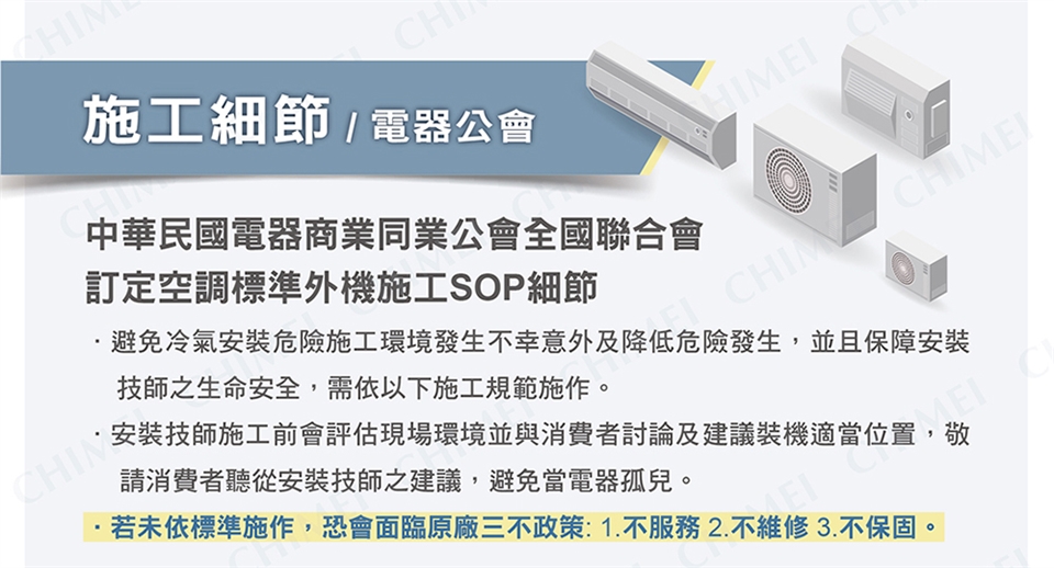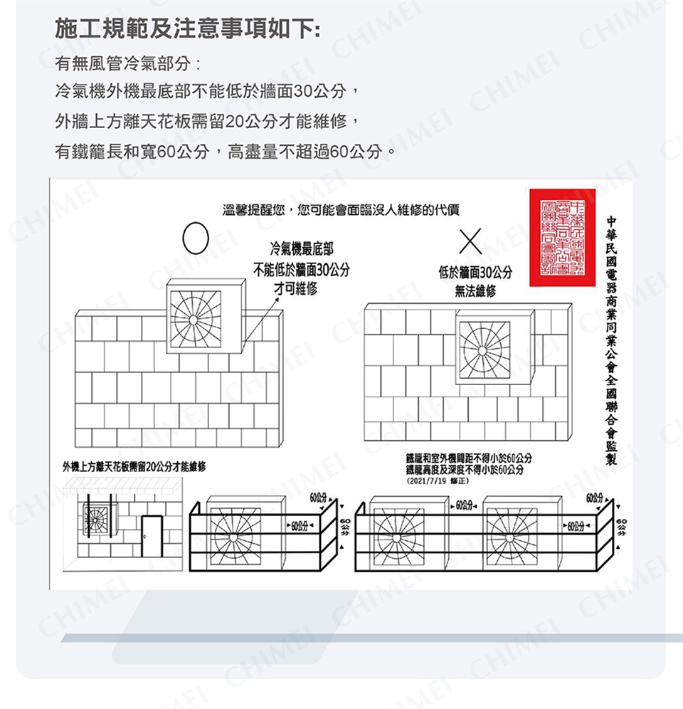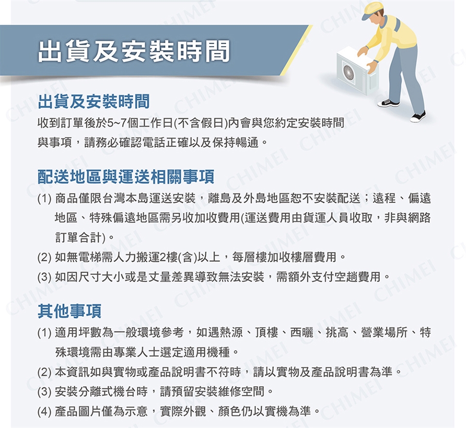2.購買時請確認商品大小與裝機尺寸,師傅已到達指定地點並到府基本安裝時(已拆箱),倘若退貨原因是「尺寸大小不符導致無法搬運及安裝、並非新品不良」,必須收外箱整新費3,000元。