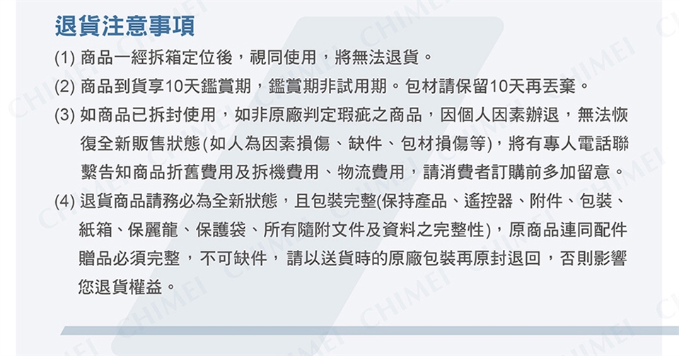 若對商品有任何問題,可於週一 ~ 週五 08:30-20:00 例假日 08:30-17:30 全年服務 (除夕/春節初一暫停服務)與奇美客服中心0800-663-000先電聯,請客服人員協助您確認商品問題及處理,謝謝您。