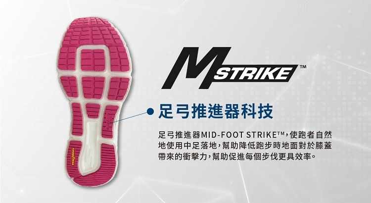 5.足弓推進器M-STRIKE®,使跑者自然地使用中足落地,降低跑步時地面對於膝蓋帶來的衝擊力,幫助促進每個步伐更具效率。