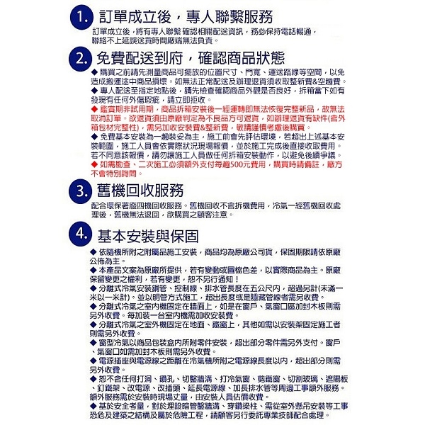 4.大家電安裝前安裝機師確認不符安裝需求,經消費者同意安裝者則不于退貨。