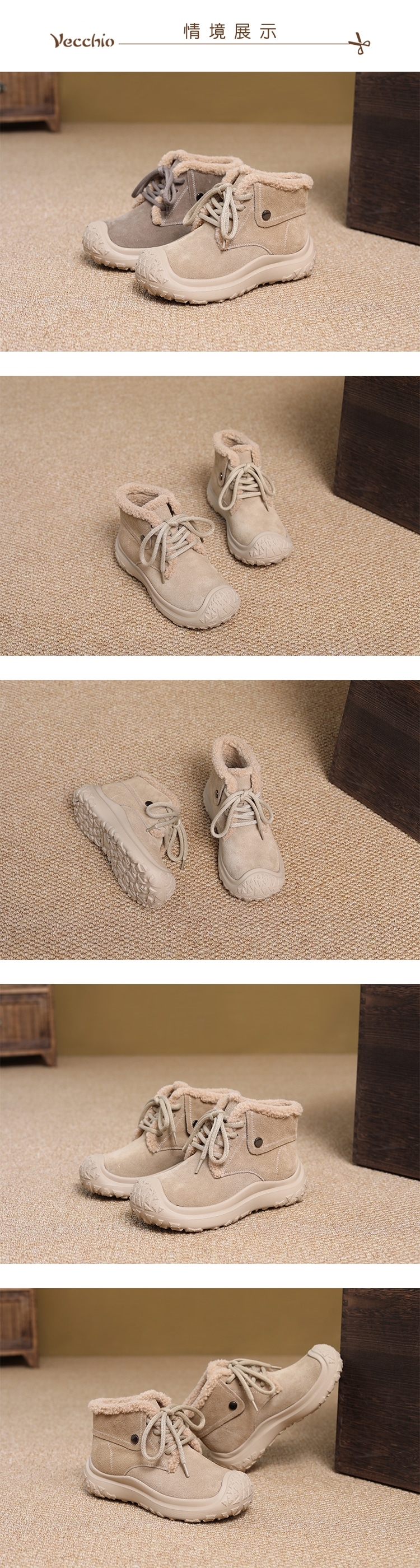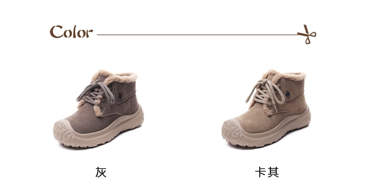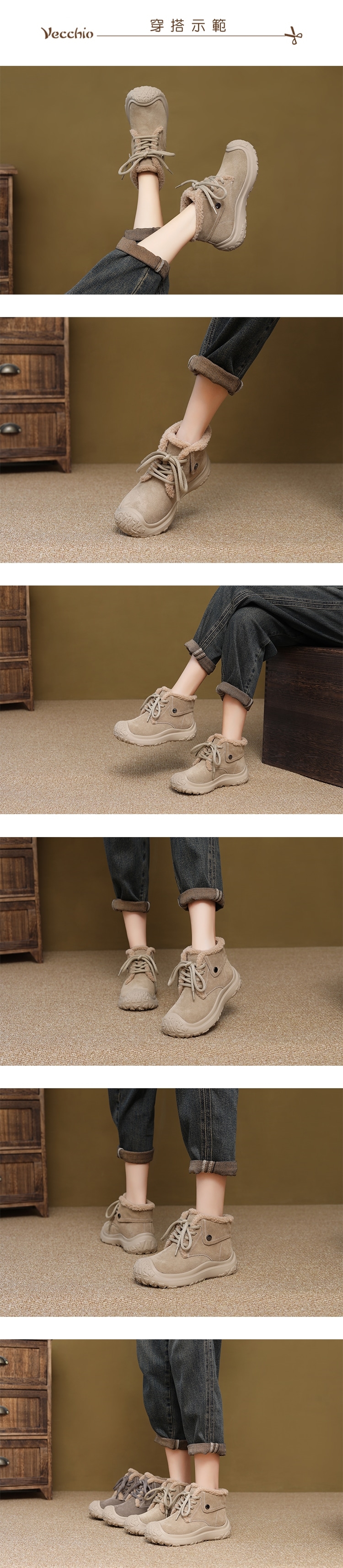 【VECCHIO】麂皮拼接厚底毛絨雪靴/經典麂皮絨面復古拼接厚底毛絨滾邊雪靴 女鞋 卡其