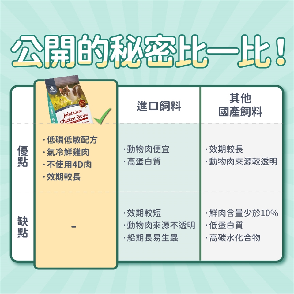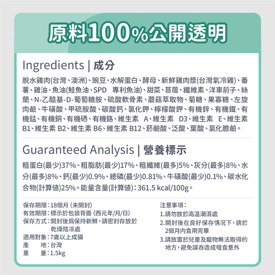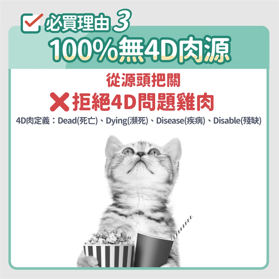 👉我們的動物肉來源,堅持不使用4D肉,即已死亡(Dead)、瀕死(Dying)、有疾病(Disease)、有殘缺(Disable)的動物。只使用最健康的雞肉、魚肉等肉品來源,給貓咪最優質的蛋白質。
