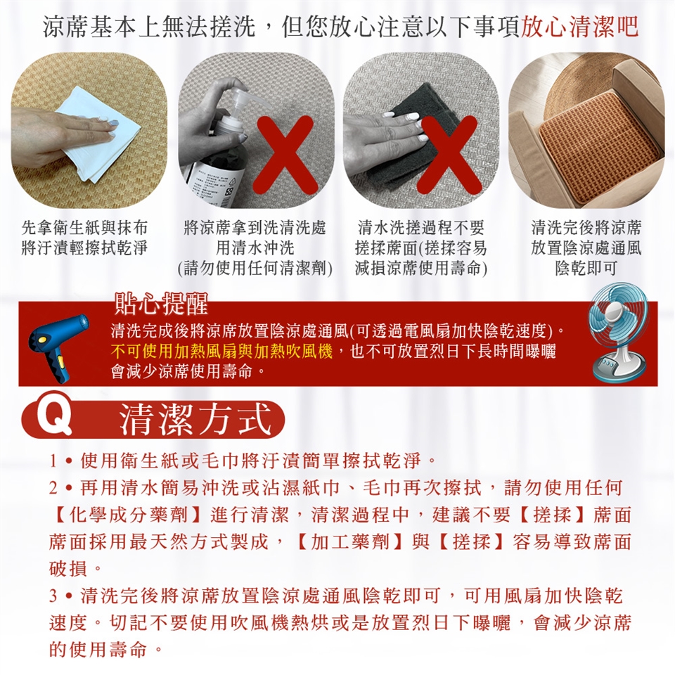 -建議以紙巾或沾濕布擦拭蓆面,並陰乾或暖曬即可去除濕氣,切勿使用清潔劑、長時間過度曝曬烈日下。