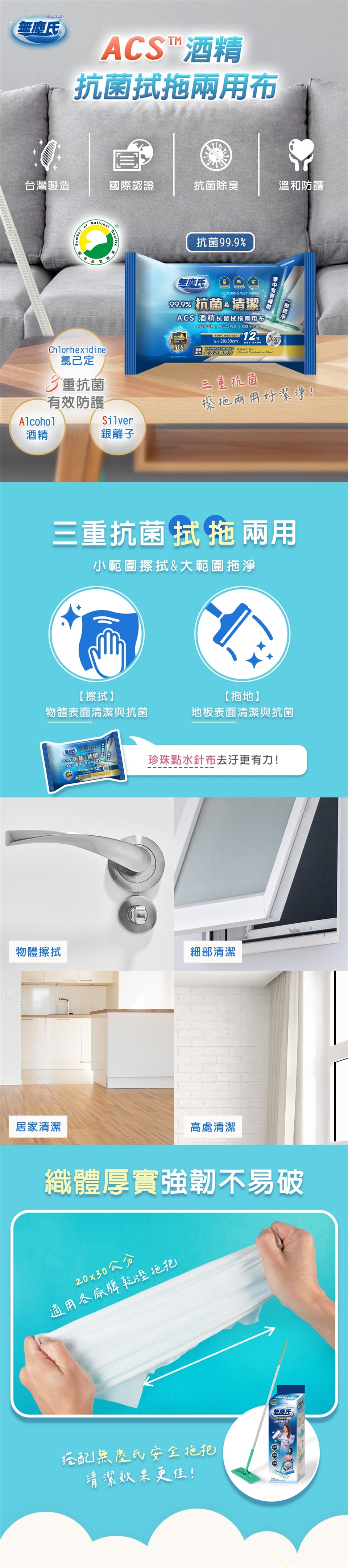 可直接擦拭,用於一般清潔&抗菌;或配合無塵氏除塵拖把使用,效率加倍