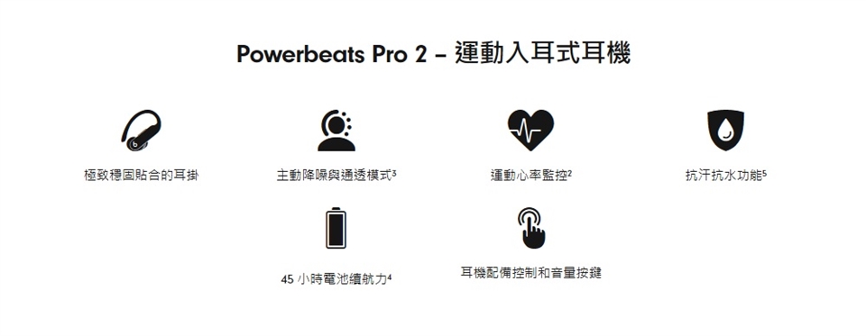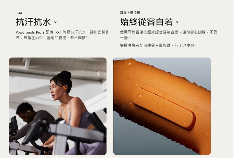 8.Powerbeats Pro 2具備抗汗抗水功能,適用於各種非水上運動與活動。Powerbeats Pro 2已在受控管的實驗室環境條件下測試,達到 IEC 60529 標準的 IPX4 等級。抗汗抗水功能非永久狀態,並可能隨日常使用造成的耗損而下降。請勿嘗試為潮濕的 Powerbeats Pro 2 充電;請參閱 https://support.apple.com/zh-tw/102013,了解清潔與乾燥處理說明。充電盒不具抗汗抗水功能。