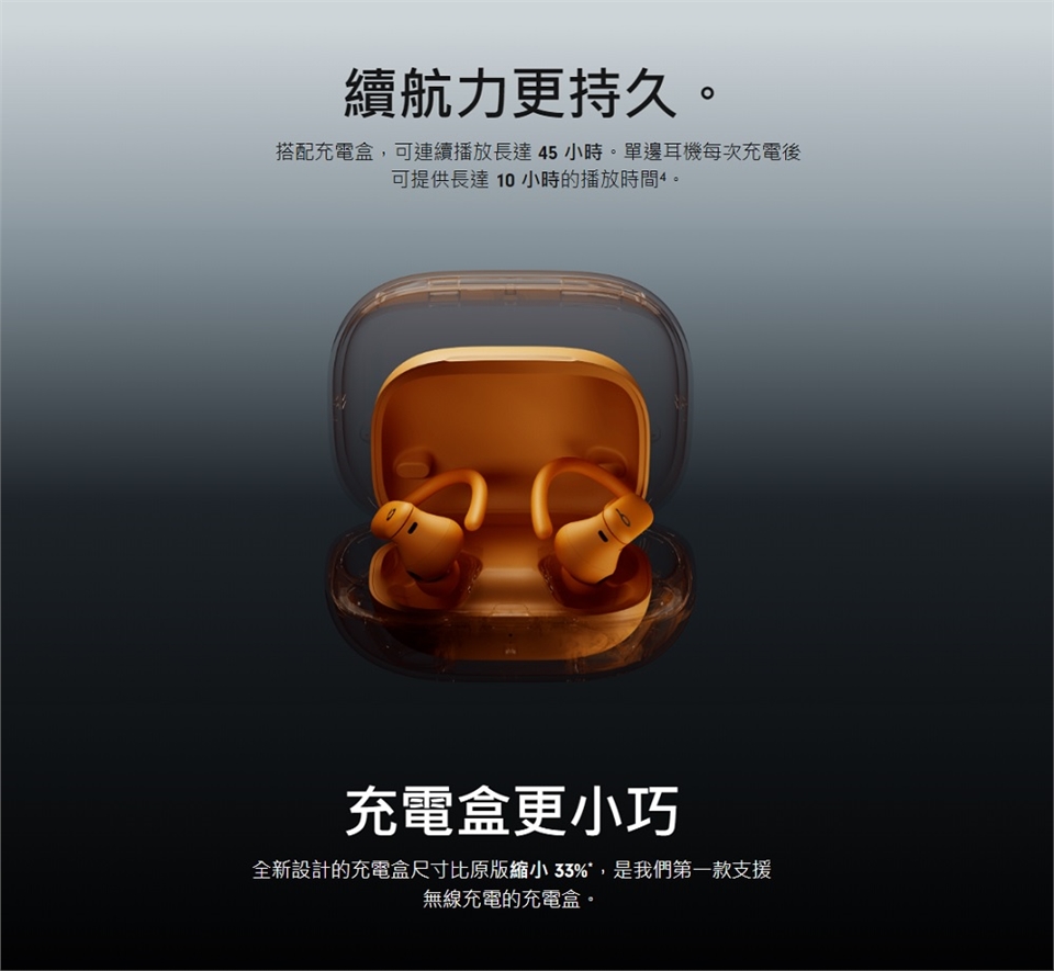 1.測試由 Apple 於 2024 年 9 月使用預量產 Powerbeats Pro 2裝置和軟體,搭配 iPhone 15 Pro 機型和測試版軟體進行。播放列表包括 358 首購自 iTunes Store 的不同曲目 (256-Kbps AAC 編碼)。音量設定在 50%,「主動降噪」和「通透模式」為關閉狀態。測試方式為播放音訊,直到其中一邊 Powerbeats Pro 2耗盡電池電力並停止播放為止。主動降噪功能開啟時,耳機最長可連續播放 8 小時,電池續航力總計 36 小時 (搭配充電盒)。電池使用時間視裝置設定、環境、使用情況與許多其他因素而定。
