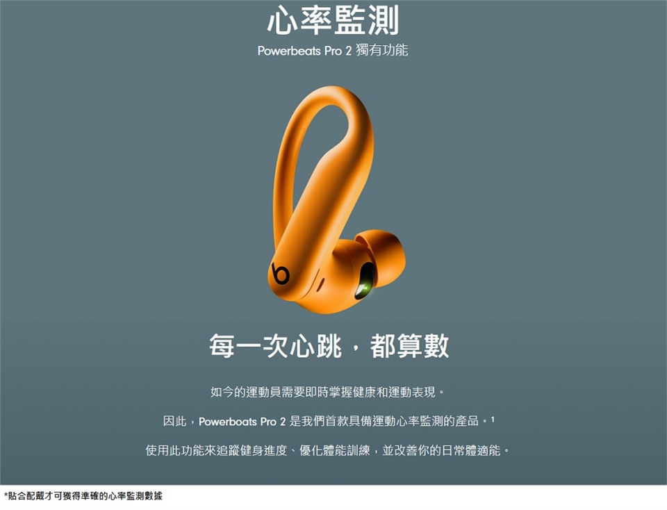 3.內建心率監測功能專門測量訓練時的心率,可在相容的第三方 app 上使用。請參閱 beatsbydre.com/tw/hrm,查看相容的應用程式和說明。iPhone 會自動開始心率監測,但 Android 使用者則需手動啟動此功能。若要停用心率監測器,可前往 iPhone 的「設定」或 Android 版 Beats app 操作。