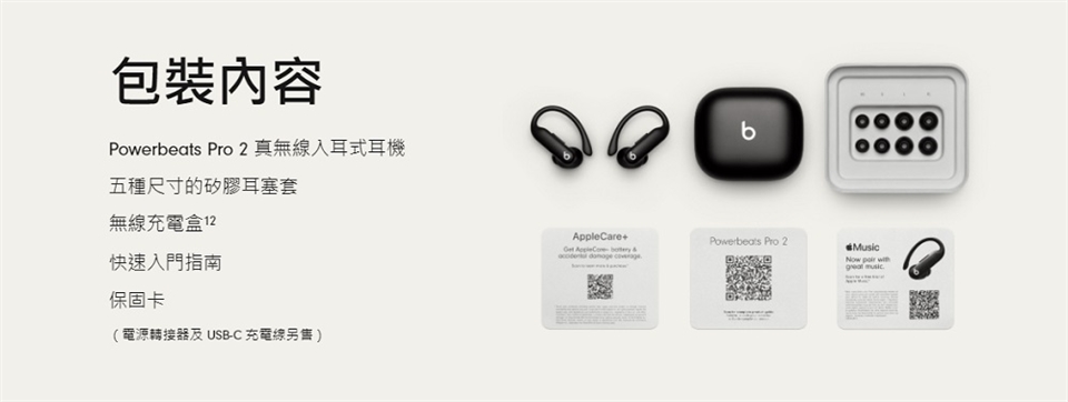 6.測試由 Apple 於 2024 年 9 月使用預量產 Powerbeats Pro 2裝置和軟體,搭配 iPhone 15 Pro 機型和測試版軟體進行。播放列表包括 358 首購自 iTunes Store 的不同曲目 (256-Kbps AAC 編碼)。音量設定在 50%,主動降噪功能和通透模式為關閉狀態。5 分鐘充電測試是將電力耗盡的 Powerbeats Pro 2透過 USB-C 連接線充電 5 分鐘後,開始播放音訊,直到 Powerbeats Pro 2的其中一邊停止播放為止。電池使用時間視裝置設定、環境、使用情況與許多其他因素而定。