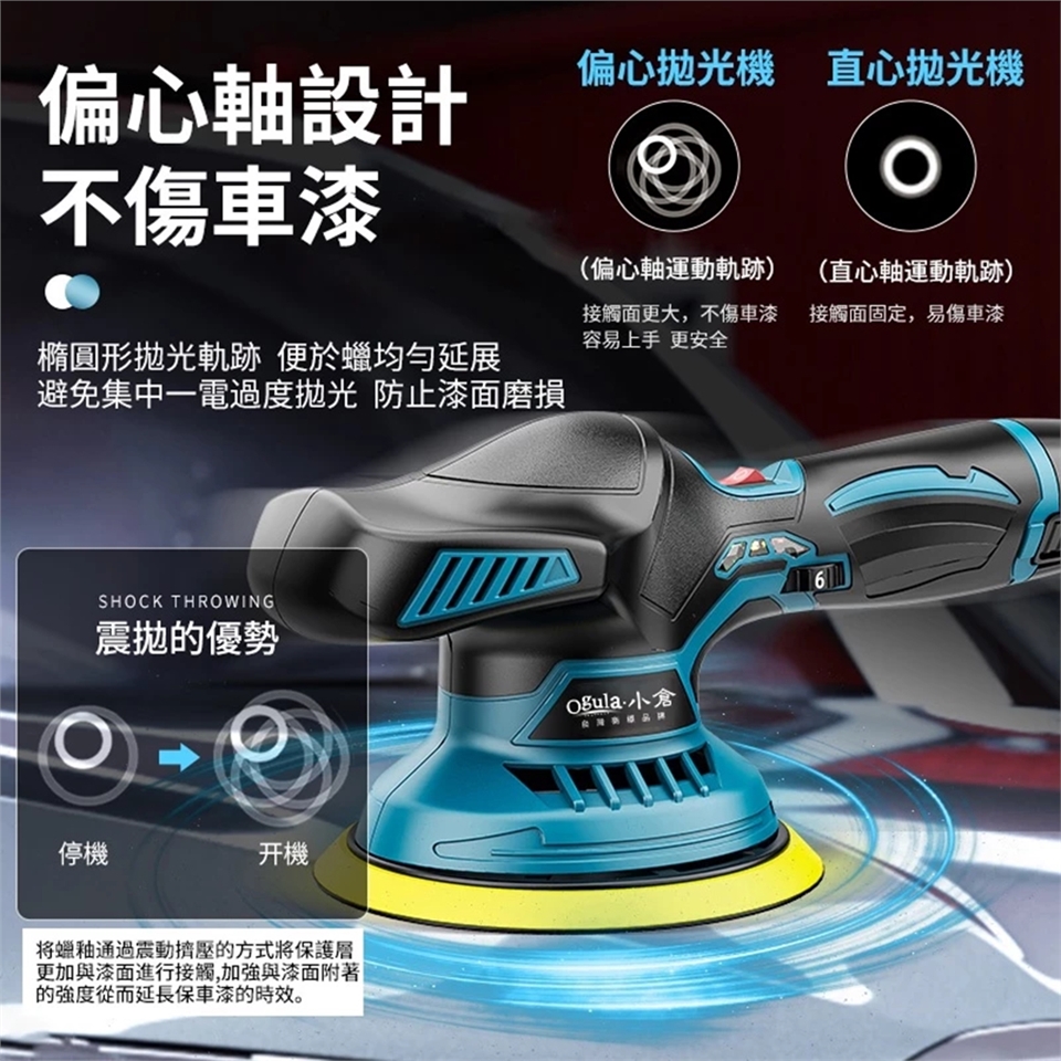 偏心軸設計 不傷車漆:橢圓形拋光軌跡 便於蠟均勻延展 避免集中一電過度拋光 防止漆面磨損