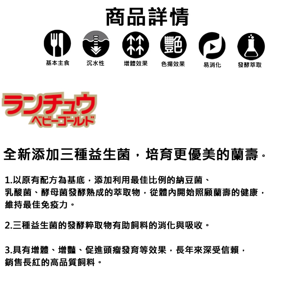 利用生物科技研發的沉水性日常飼料,著重於打造出蘭壽傲人的頭瘤,更有卓越的增豔與增體功效,讓金魚維持健康。