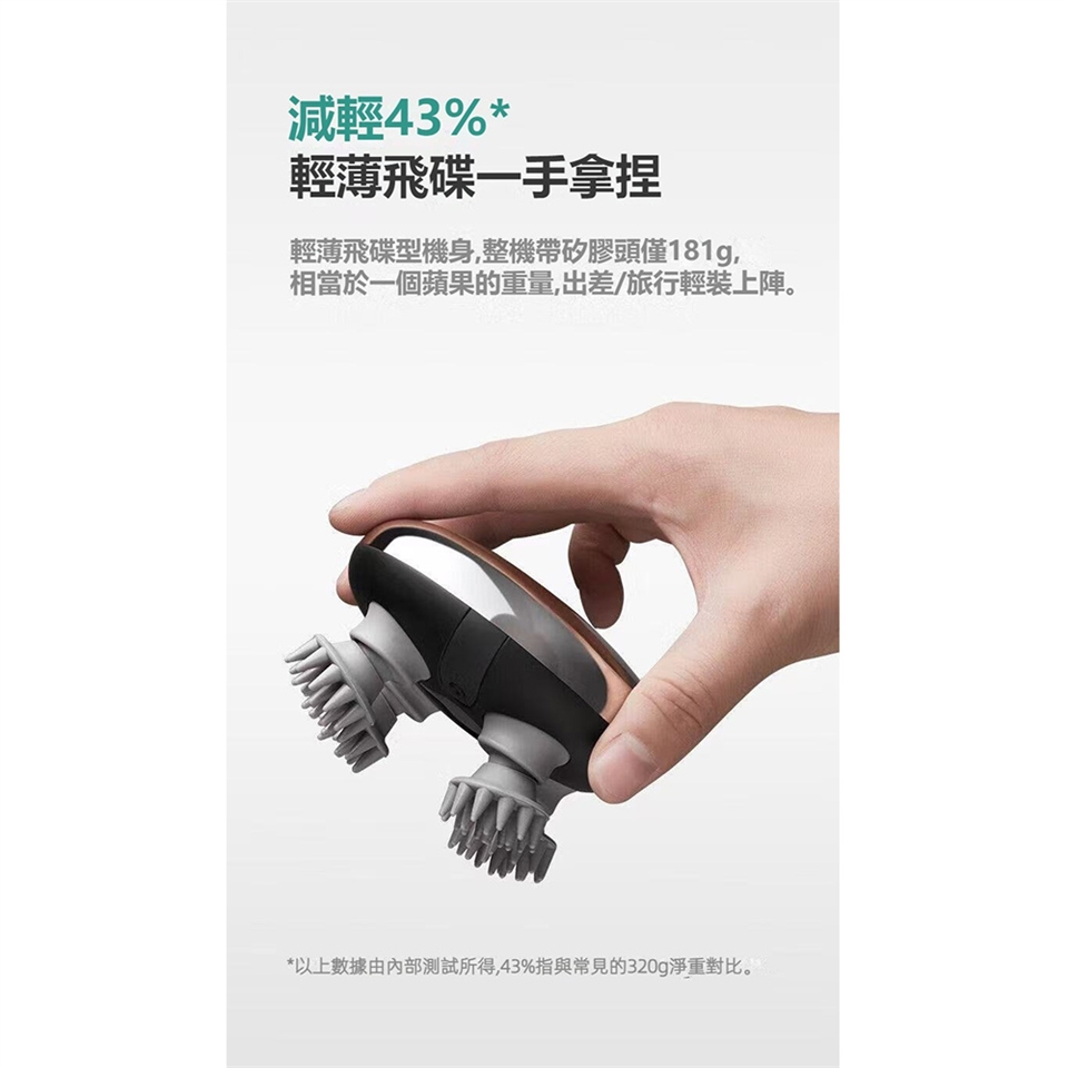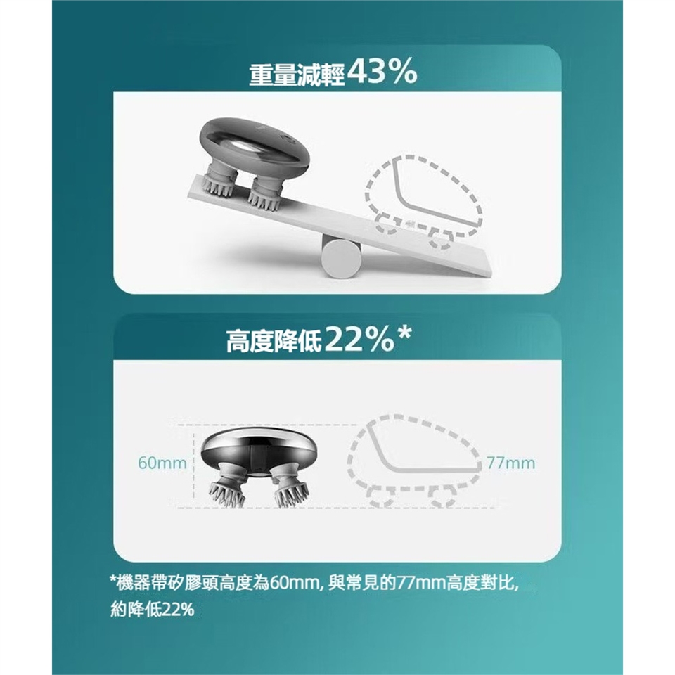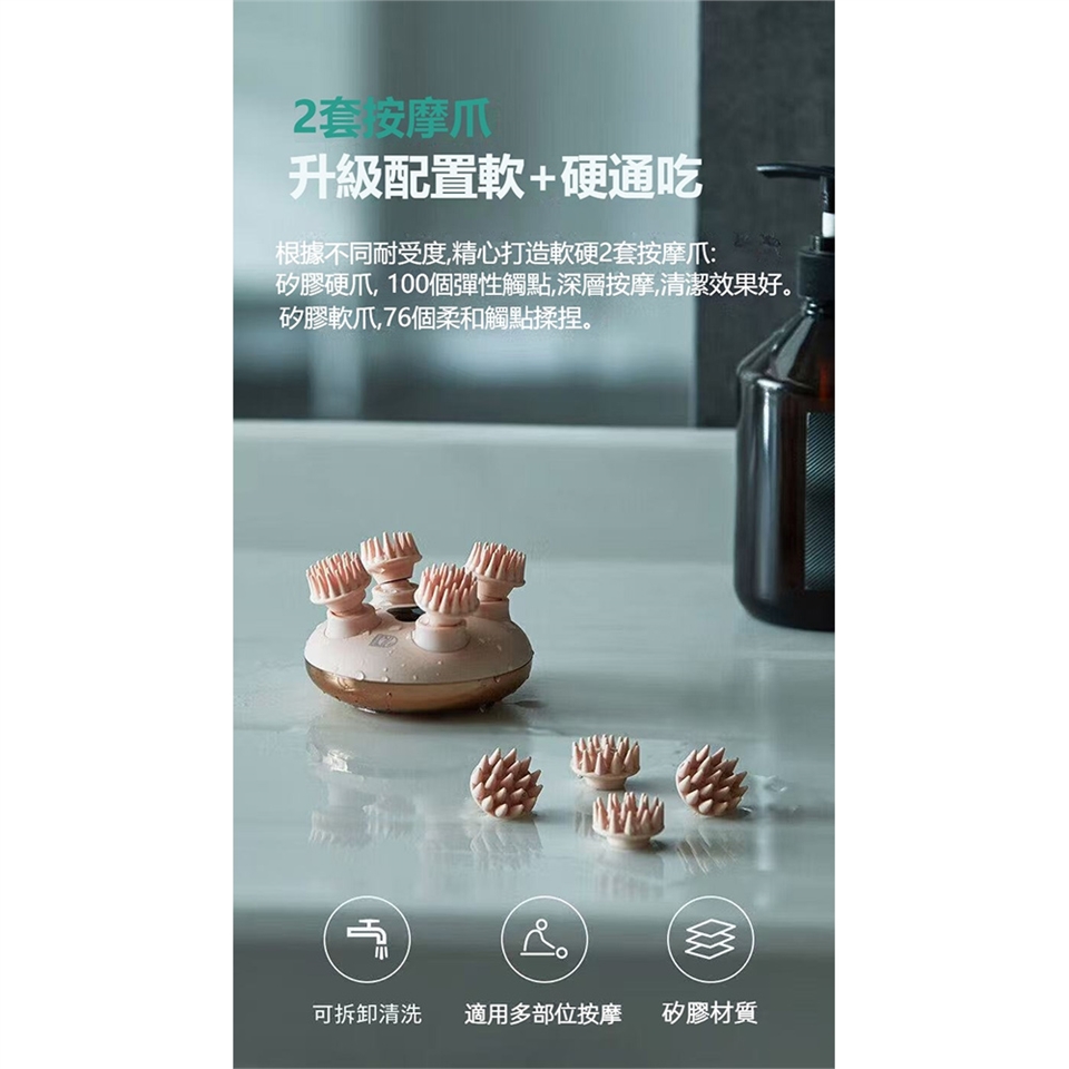 兩組不同柔軟度的矽膠按摩爪,可更換,使用範圍較廣。柔軟厚實的毛刷按摩爪,質地柔軟,觸感面積大,舒適貼合,適合全身按摩,使頭皮敏感的用戶盡情放鬆。中軟纖細毛刷按摩爪,配備 100 個觸點,硬度適中,相應地提升按摩快感。適用於耐力較強的使用者和頭皮清潔。