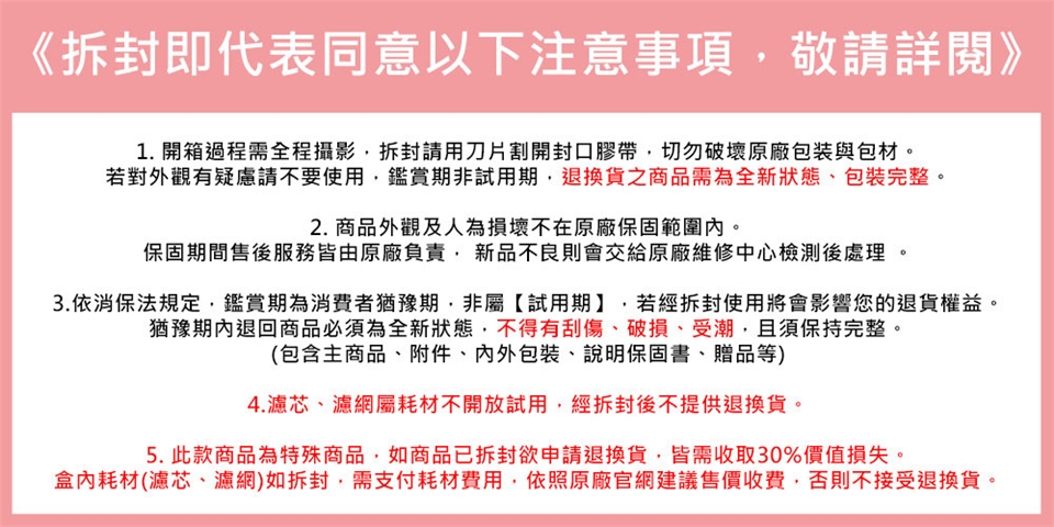 1..濾芯、濾網屬耗材不開放試用,經拆封後不提供退換貨。