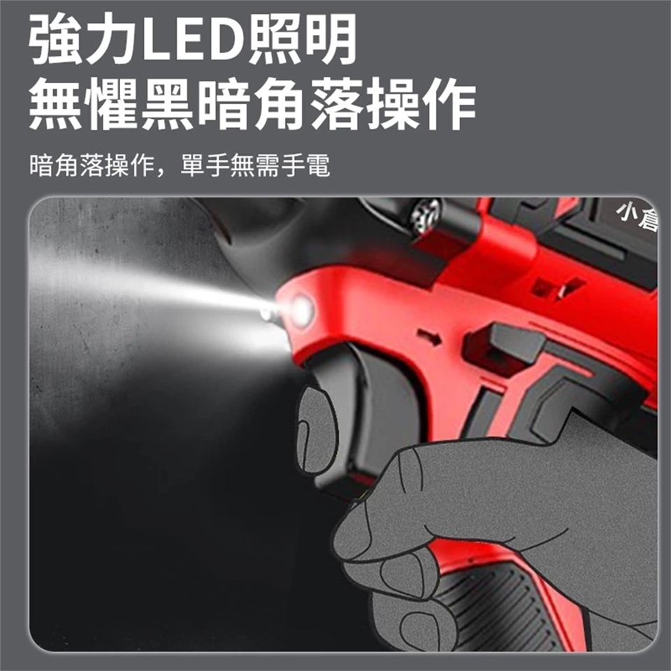 電動沖擊扳手內置LED工作燈,在釋放觸發器後會保持約20S的亮度,有助於在黑暗或狹窄的環境中工作。 一旦按下電源觸發器,您將對其光滑的觸感印象深刻。 沖擊槍的傳感系統能夠快速識別壓力的微小變化,以實現更精確的速度控製