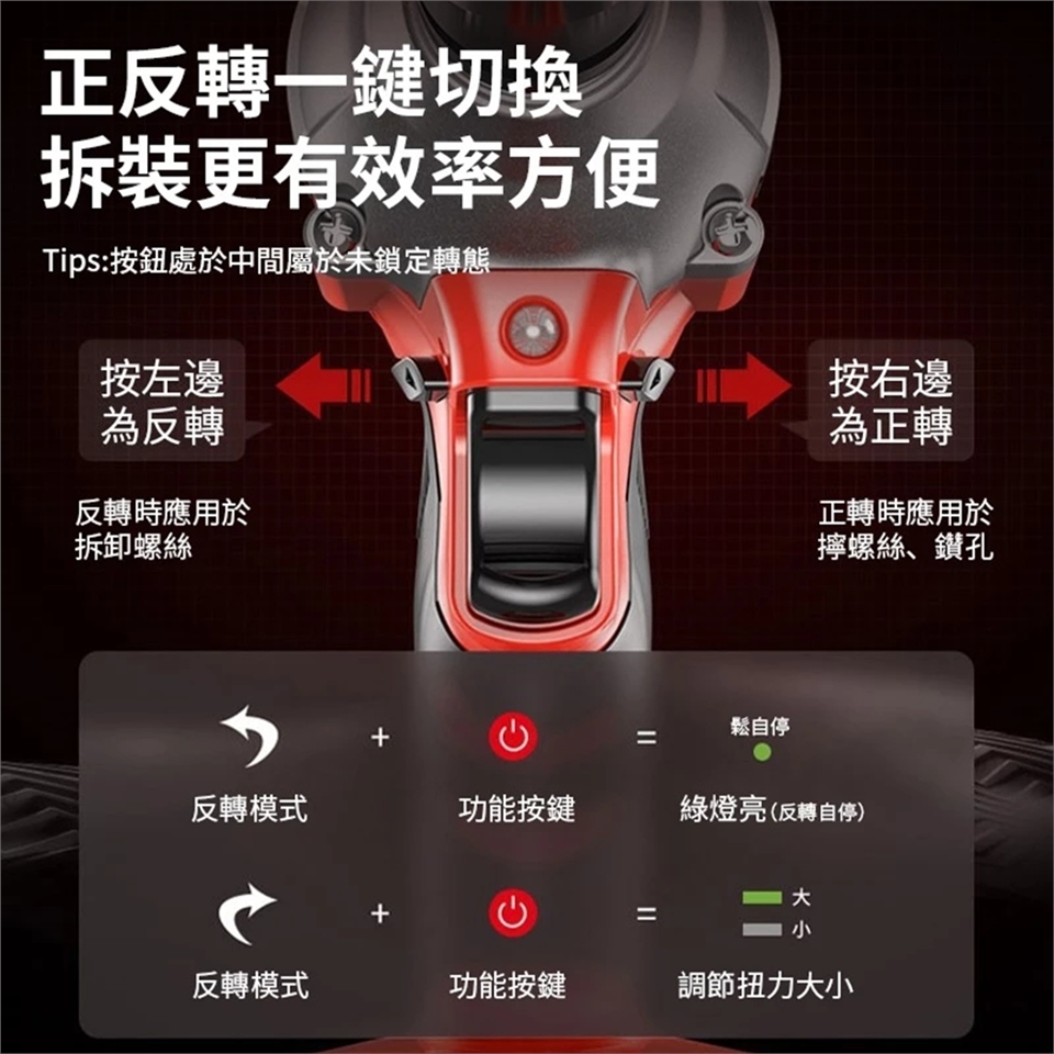 1/2沖擊扳手采用底部開關,可滿足不同工作需求,提高效率,節省電池電量。 還可以通過側邊按鈕順時針或逆時針旋轉。 反向旋轉時,按下開關按鈕可觸發製動停止功能,無需擔心螺母螺栓松動後掉落或損壞