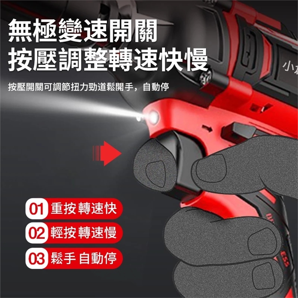 ①按壓重 轉數快 ②按壓輕 轉數慢 ③鬆開手 自動停