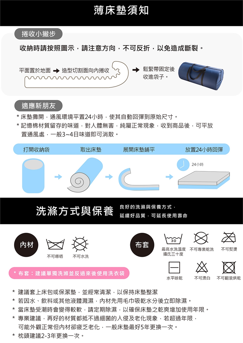 ◆洗滌方式:床墊內材不可曝曬、不可水洗;布套建議單獨洗滌並反過來後使用洗衣袋。
