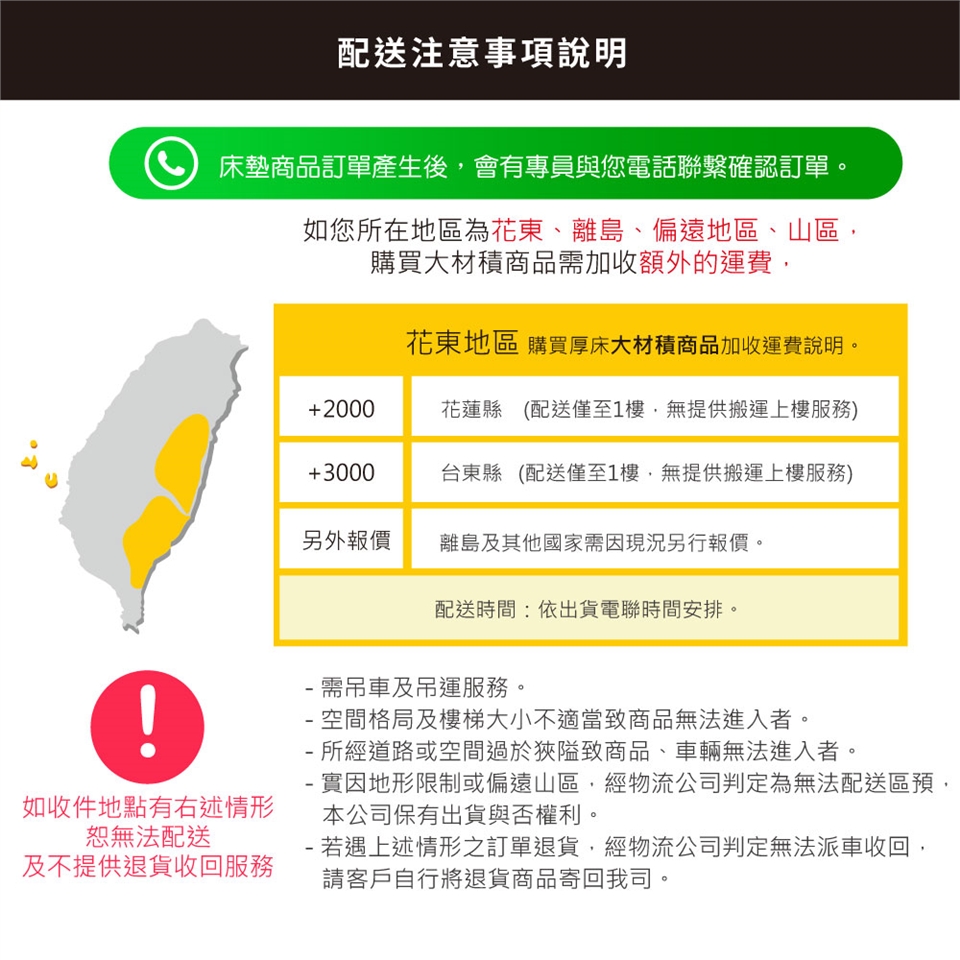 ◆送達地點有否限制:限台灣本島地區,大材積商品花東地區、離島、偏遠地區外需另加收運費,若因特殊地形無法配送,本公司保有出貨與否權力,外島地區恕不接單。