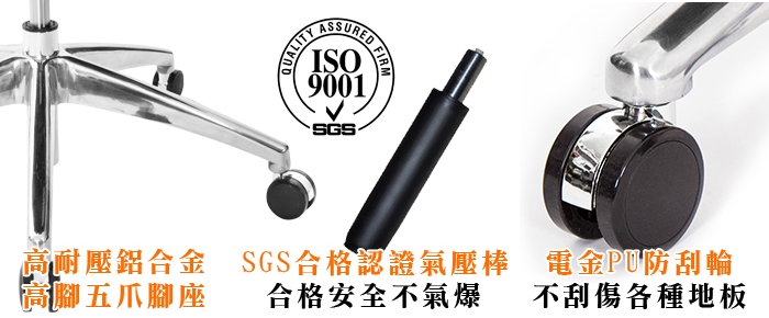 腳座採用一體成型鋁合金腳座,高腳型耐壓規格,體重120KG以下可安心使用,金屬拋光原色,線條俐落大方,腳座底部採用『多層交叉』的結構,更加強化產品的穩定性,堅固耐用,使用多年都不易發生塑斷裂、變形的問題。