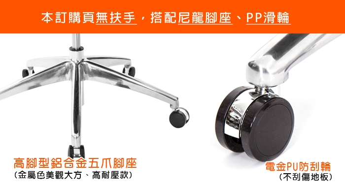 本訂購頁規格:無扶手、鋁合金高腳座、PU防刮輪