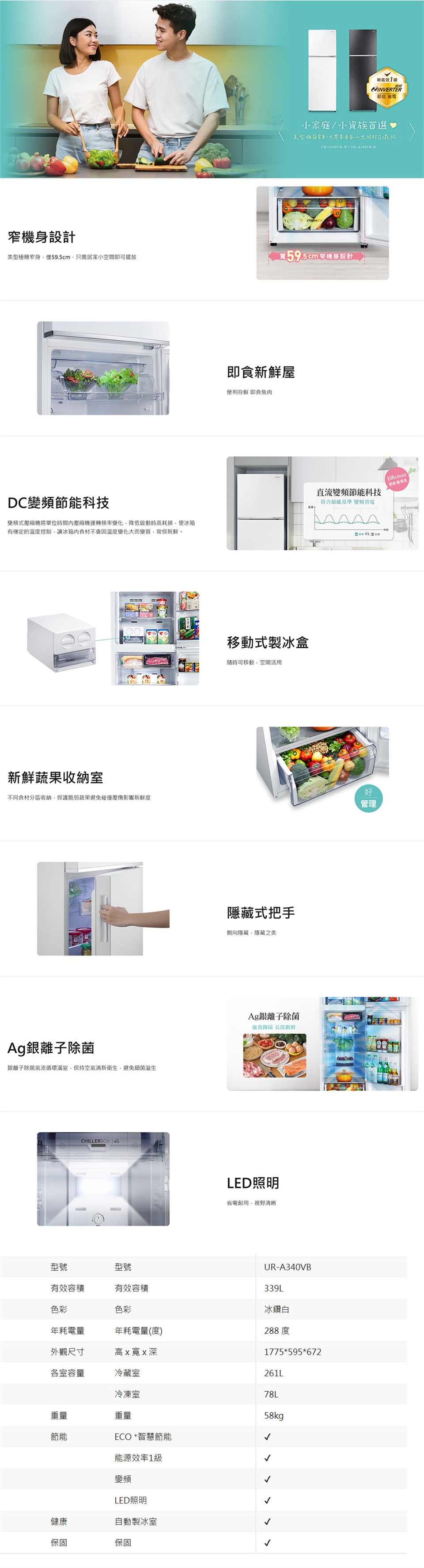 CHIMEI奇美339公升變頻雙門冰箱UR-A340VB-W冰鑽白