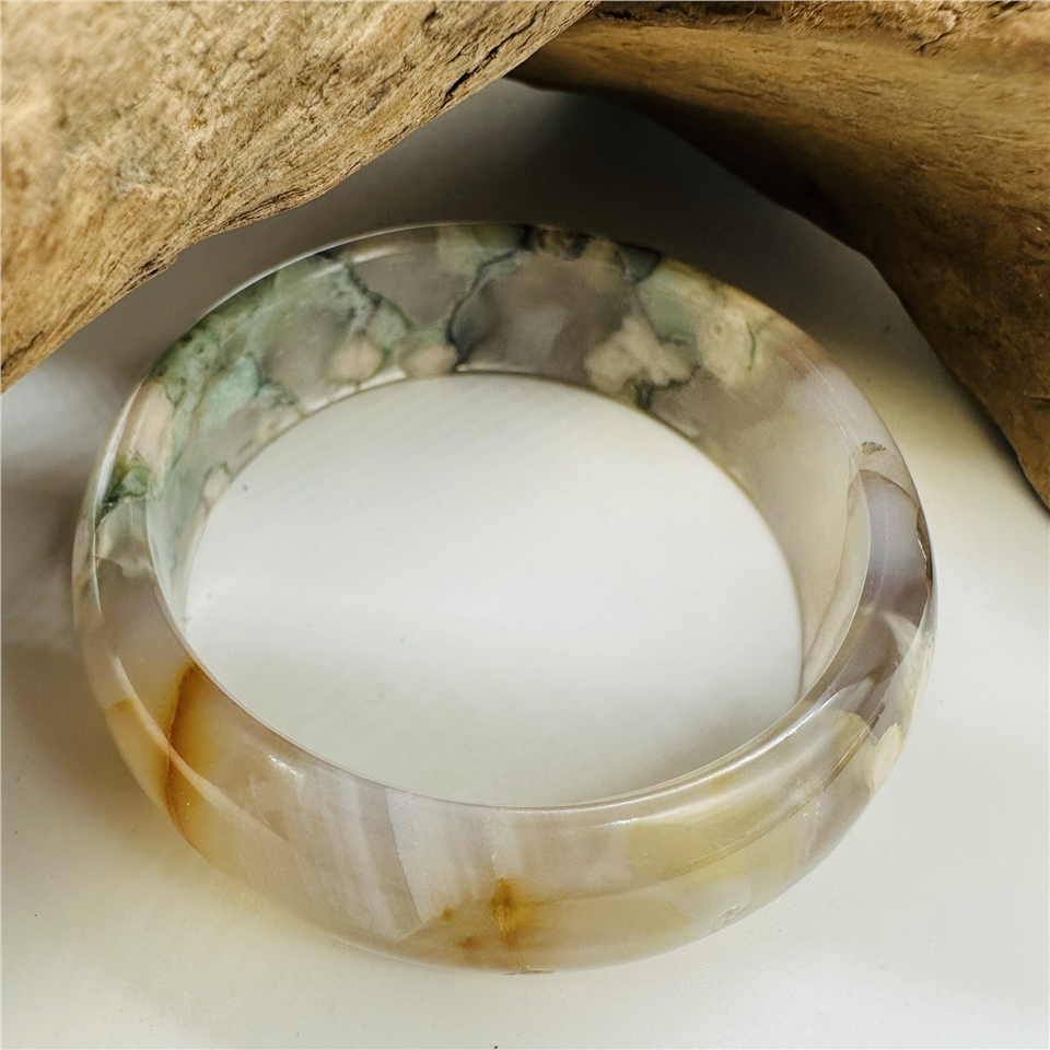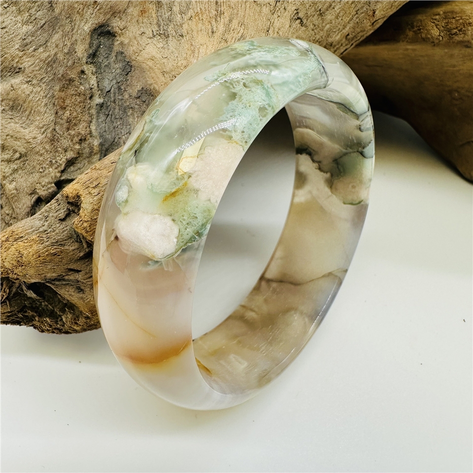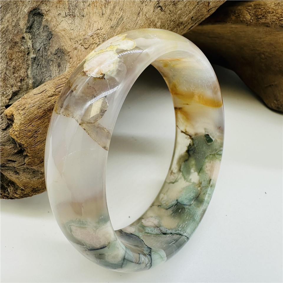 櫻花瑪瑙,又稱為櫻花玉髓(Cherry Blossom Agate),是一種來自非洲馬達加斯加的珍稀寶石。它因內含獨特的白色或粉色礦物花紋,宛如朵朵櫻花綻放在透亮的瑪瑙之中,因此得名「櫻花瑪瑙」。每一只手鐲都是大自然的藝術品,獨一無二,專屬於你的美麗與優雅。