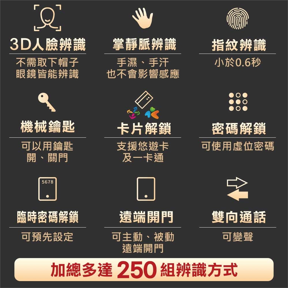 ◆人臉及掌靜脈最多可設定100組,指紋最多可設定100組,人臉+掌靜脈+指紋+密碼+卡片,共可設定250組(內含10組管理員)。