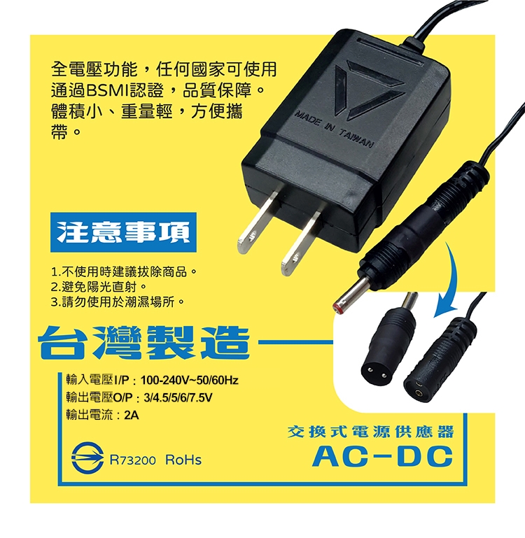 輸出電壓O/P:3/4.5/5/6/7.5V