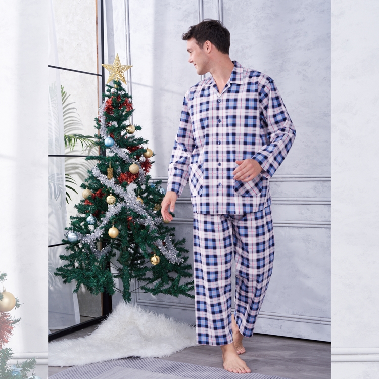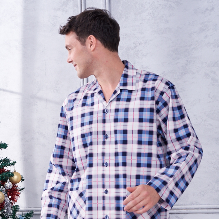 GOLDDEER金鹿 - 青年格磨毛100%棉中厚款國民領長袖褲裝睡衣