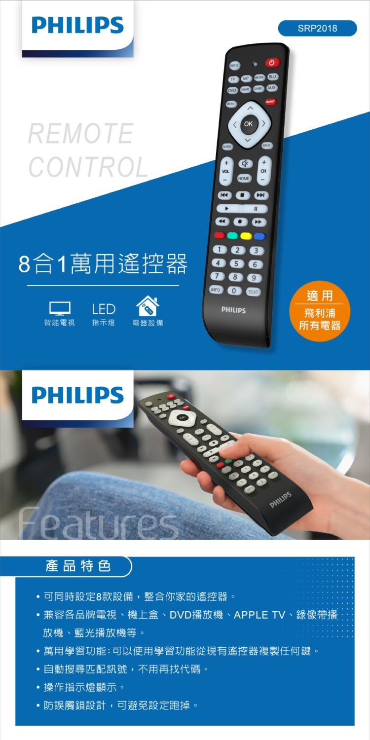 ★ 可同時設定8款設備,整合你家的遙控器。