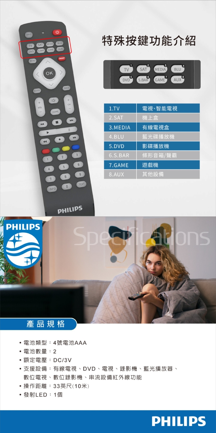 ◎ 支援設備:有線電視、DVD、電視、錄影機、藍光播放器、數位電視、數位錄影機、串流設備紅外線功能