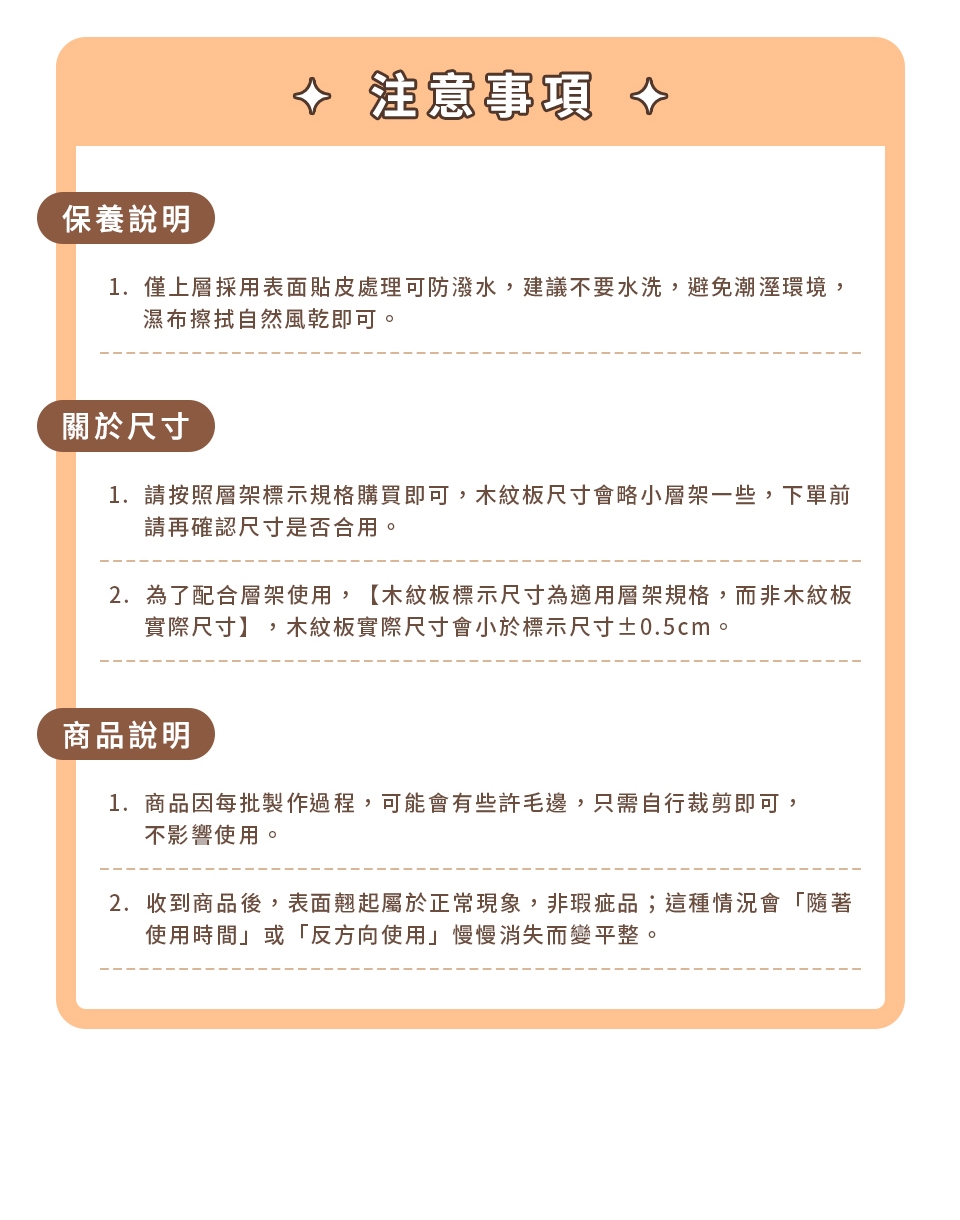 2. 為了配合層架使用,【木紋板標示尺寸為適用層架規格,而非木紋板實際尺寸】,木紋板實際尺寸會小於標示尺寸±0.5cm。