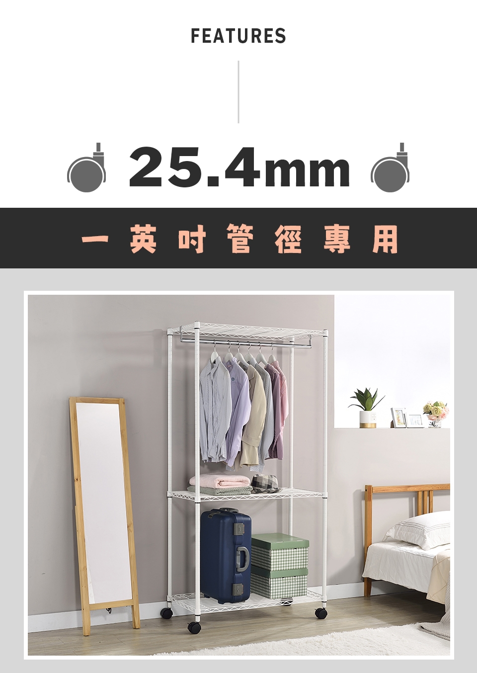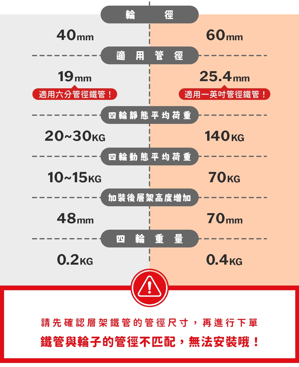 1. 層架鐵管與輪子的管徑有分25.4mm 和 19mm,網頁圖片都有清楚備註,請確認管徑尺寸再下單,鐵管與輪子管徑不一樣會無法組裝