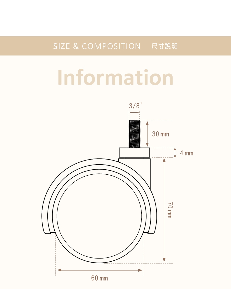 尺寸:輪徑60mm x 輪寬47mm x 總高70mm (不含螺絲牙)