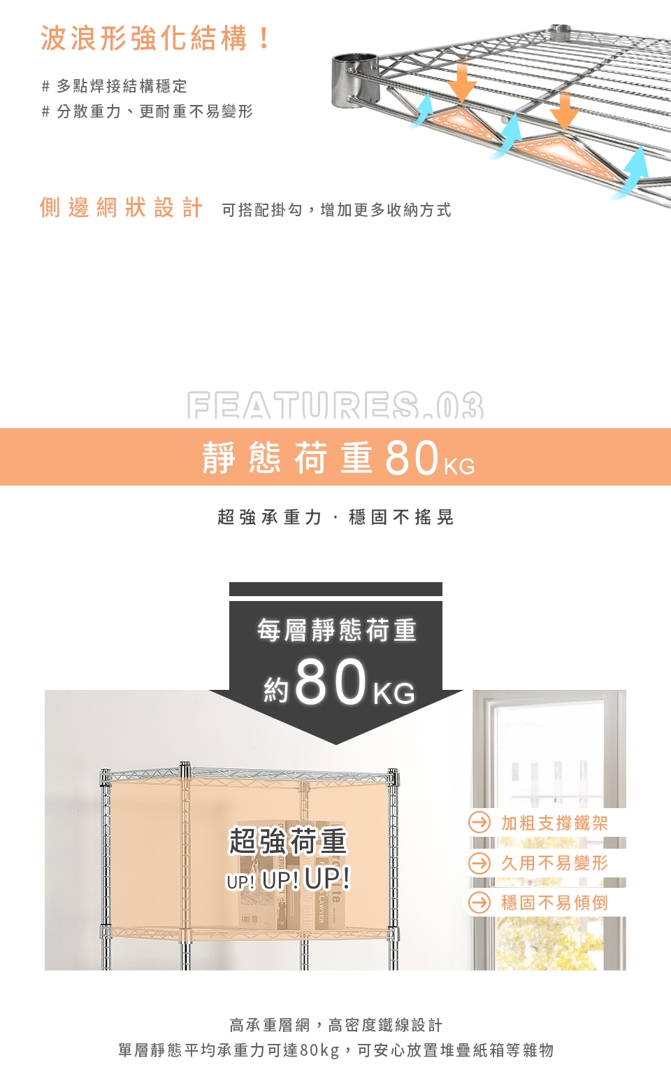 ✓ 高承重層網,單層靜態平均荷重可達80kg,安心放置、穩固耐用。