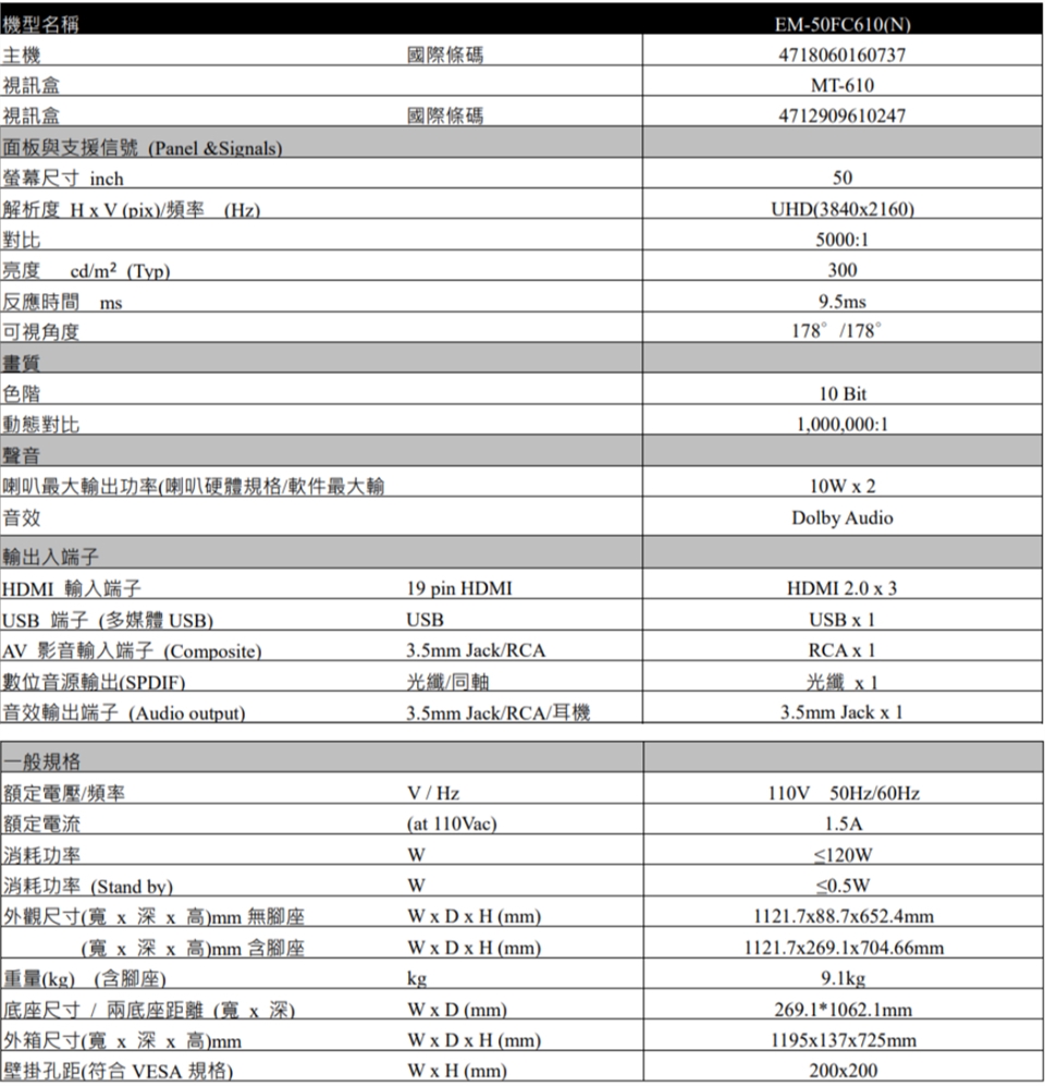 SAMPO聲寶 50吋 4K UHD 液晶顯示器EM-50FC610(N)