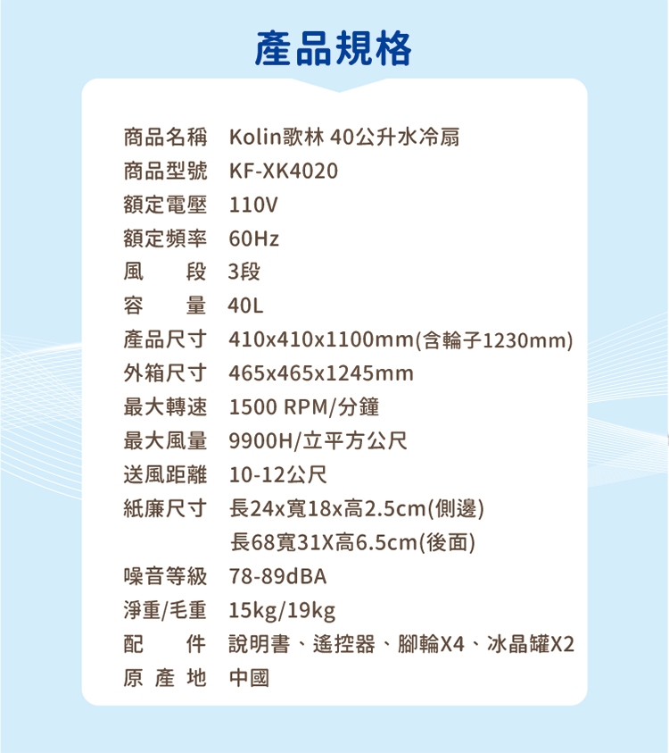 產品名稱:歌林kolin 40公升水冷扇