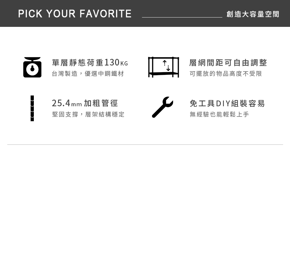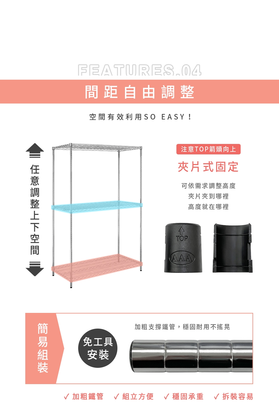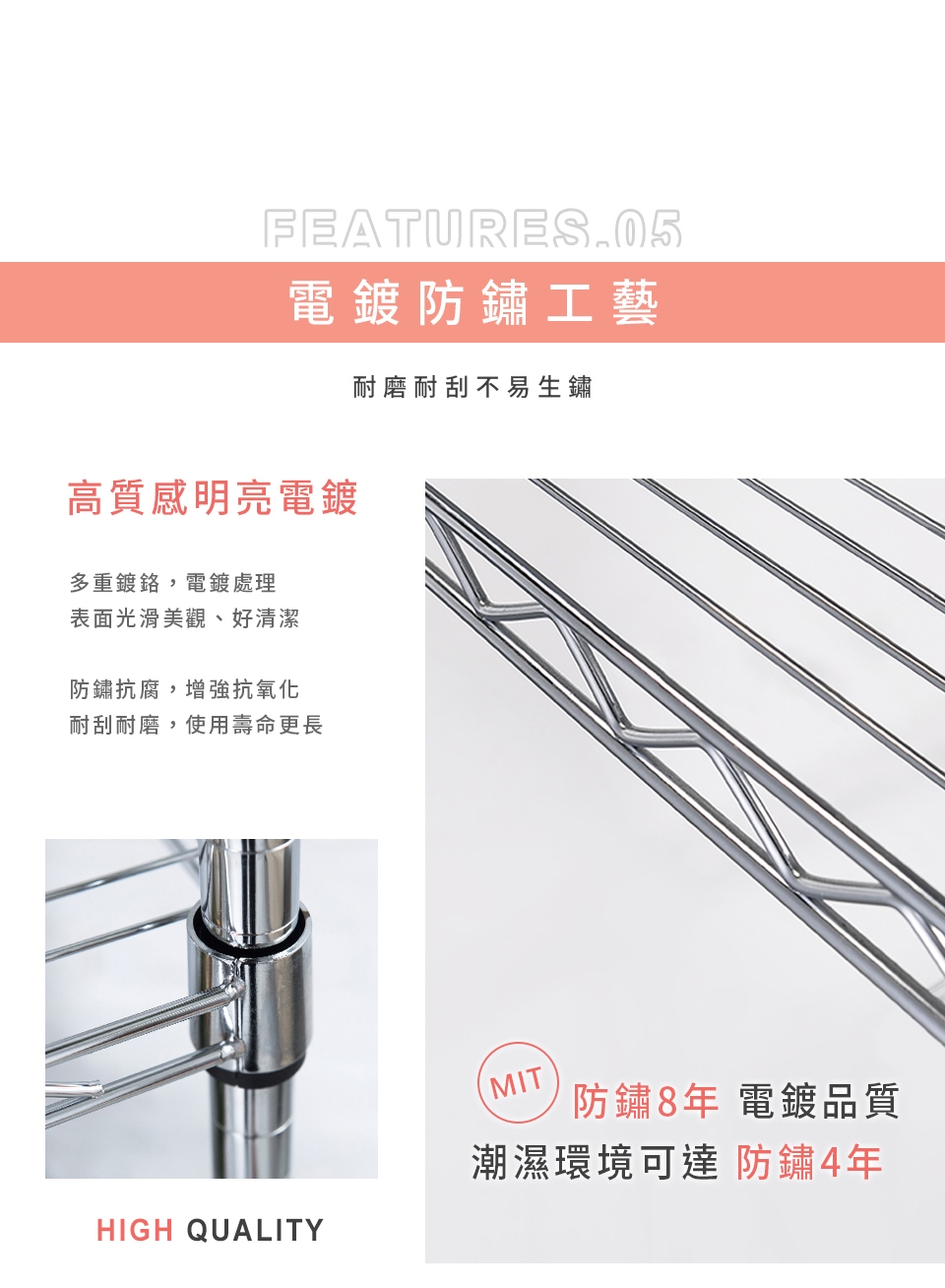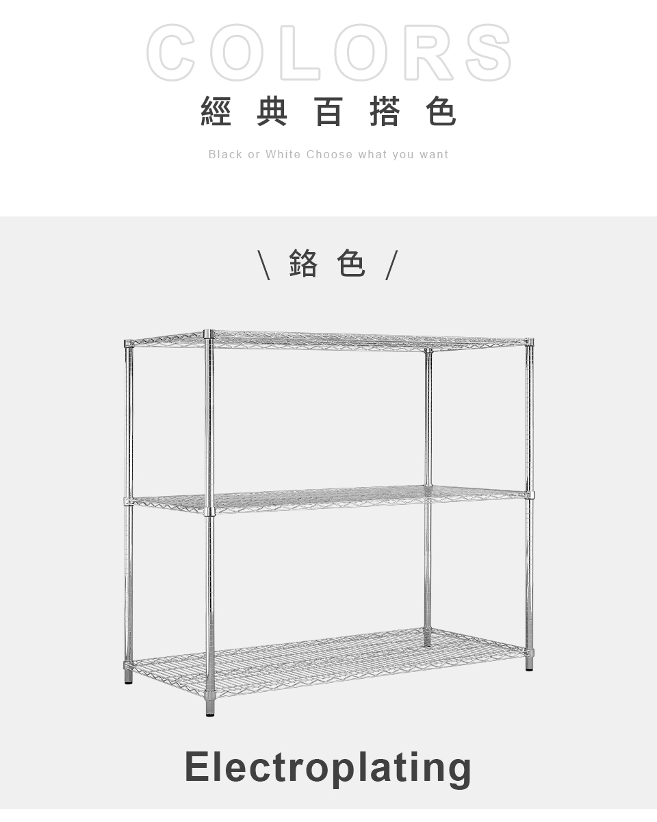 質感鐵力士層架,嚴選MIT中鋼鐵材,表面多重鍍銘、電鍍處理,呈現高質感明亮色澤,防鏽抗腐蝕、承重力強,堅固耐用!