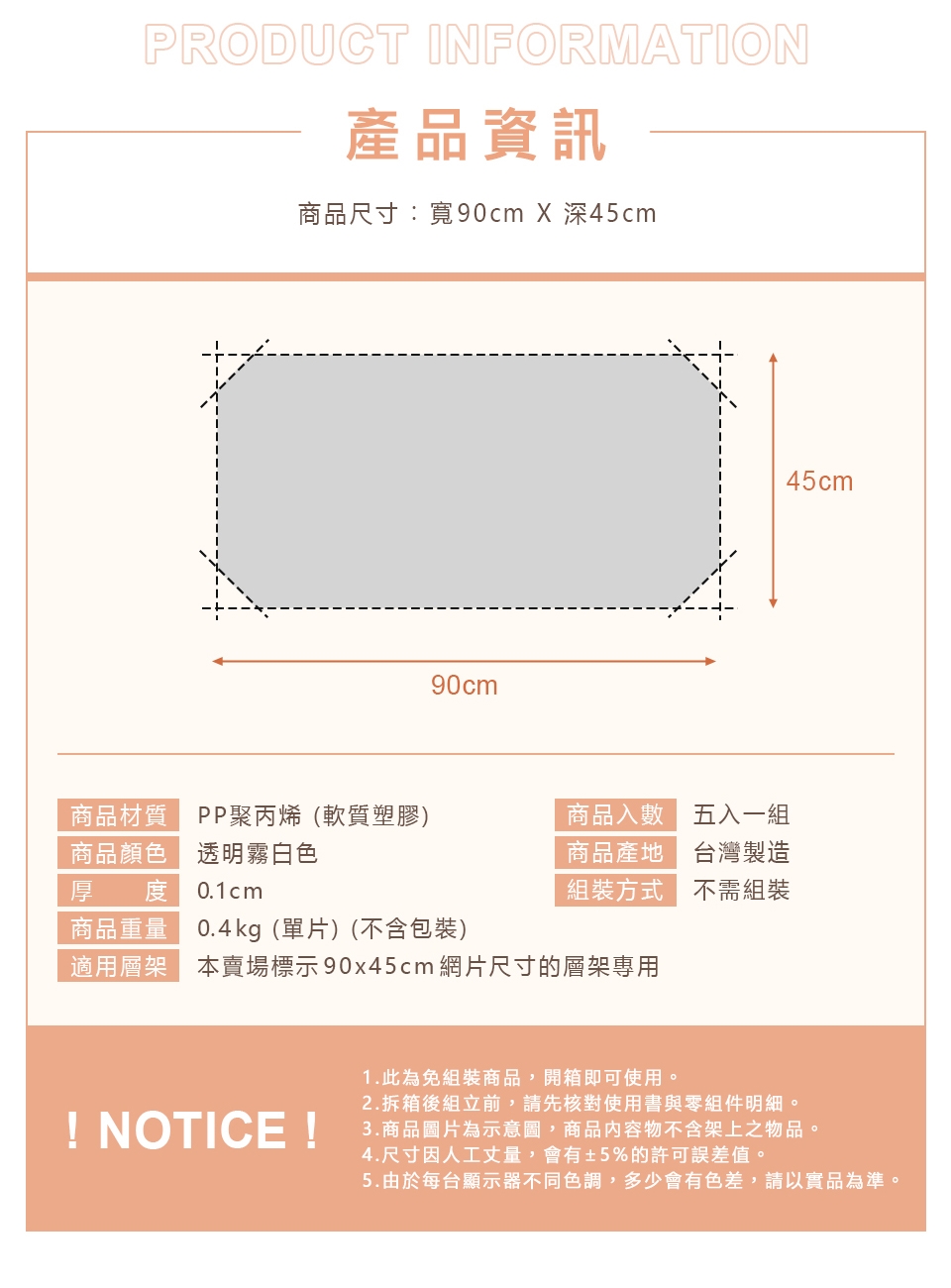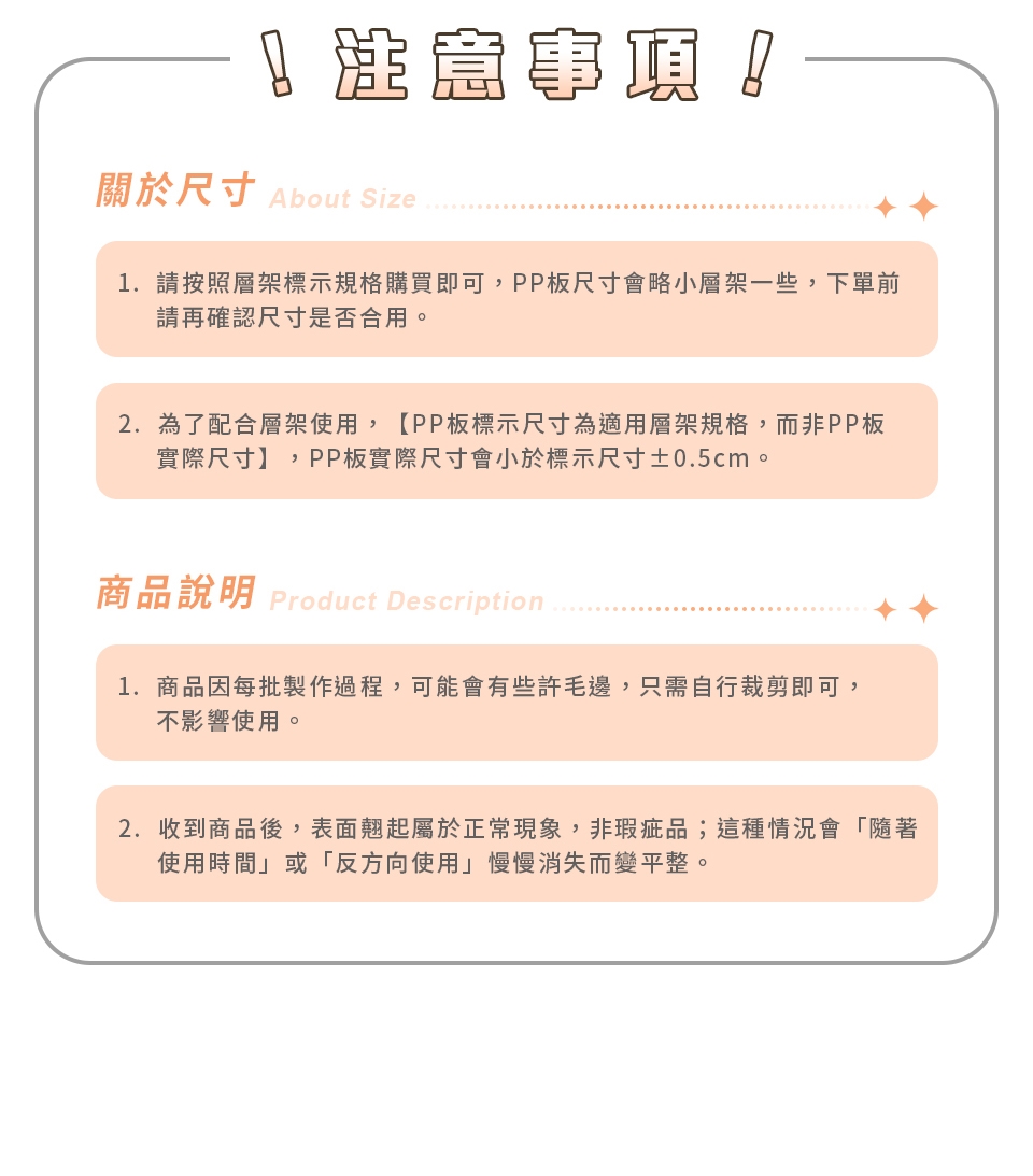 2. 為了配合層架使用,【PP板標示尺寸為適用層架規格,而非PP板實際尺寸】,PP板實際尺寸會小於標示尺寸±0.5cm。