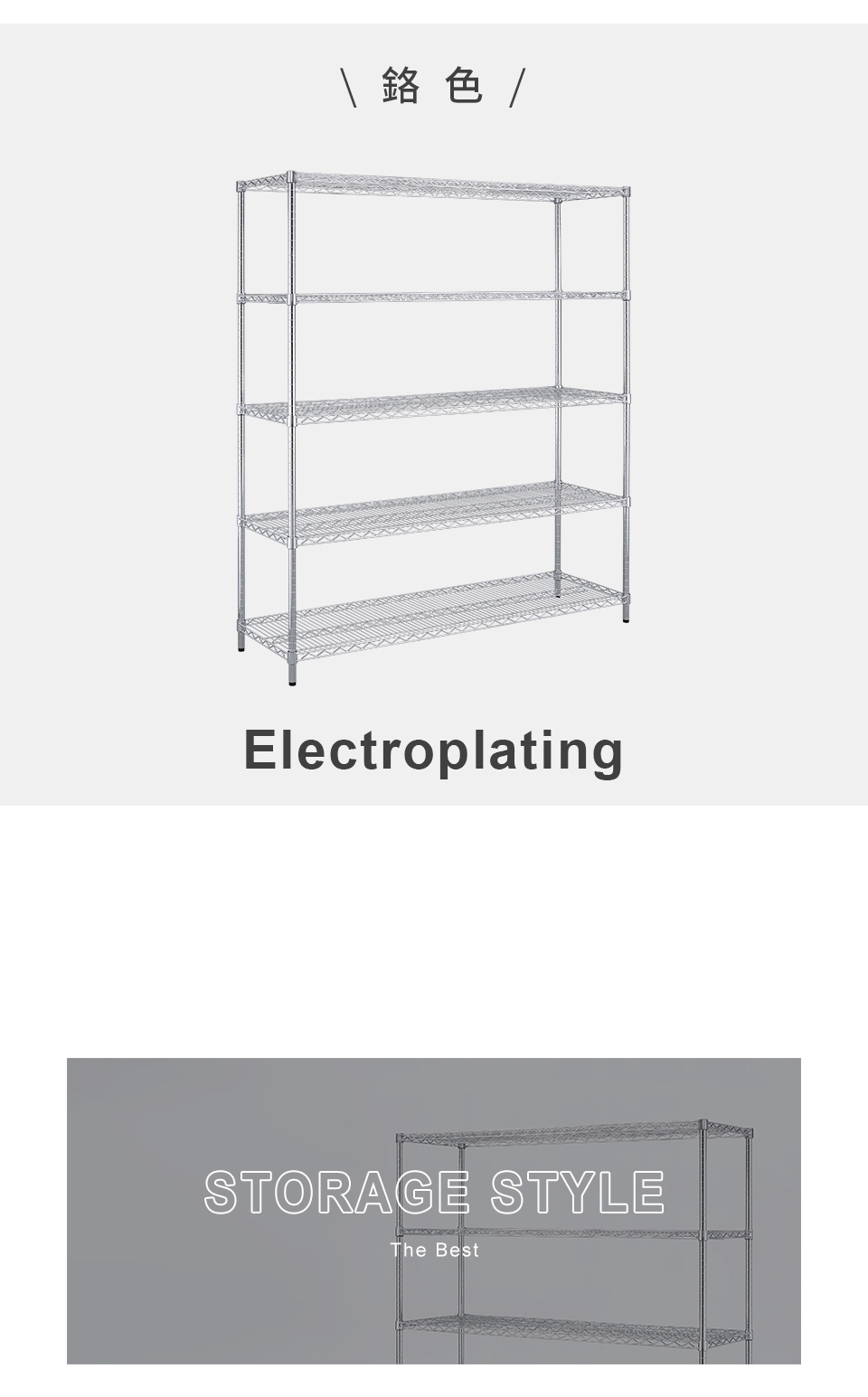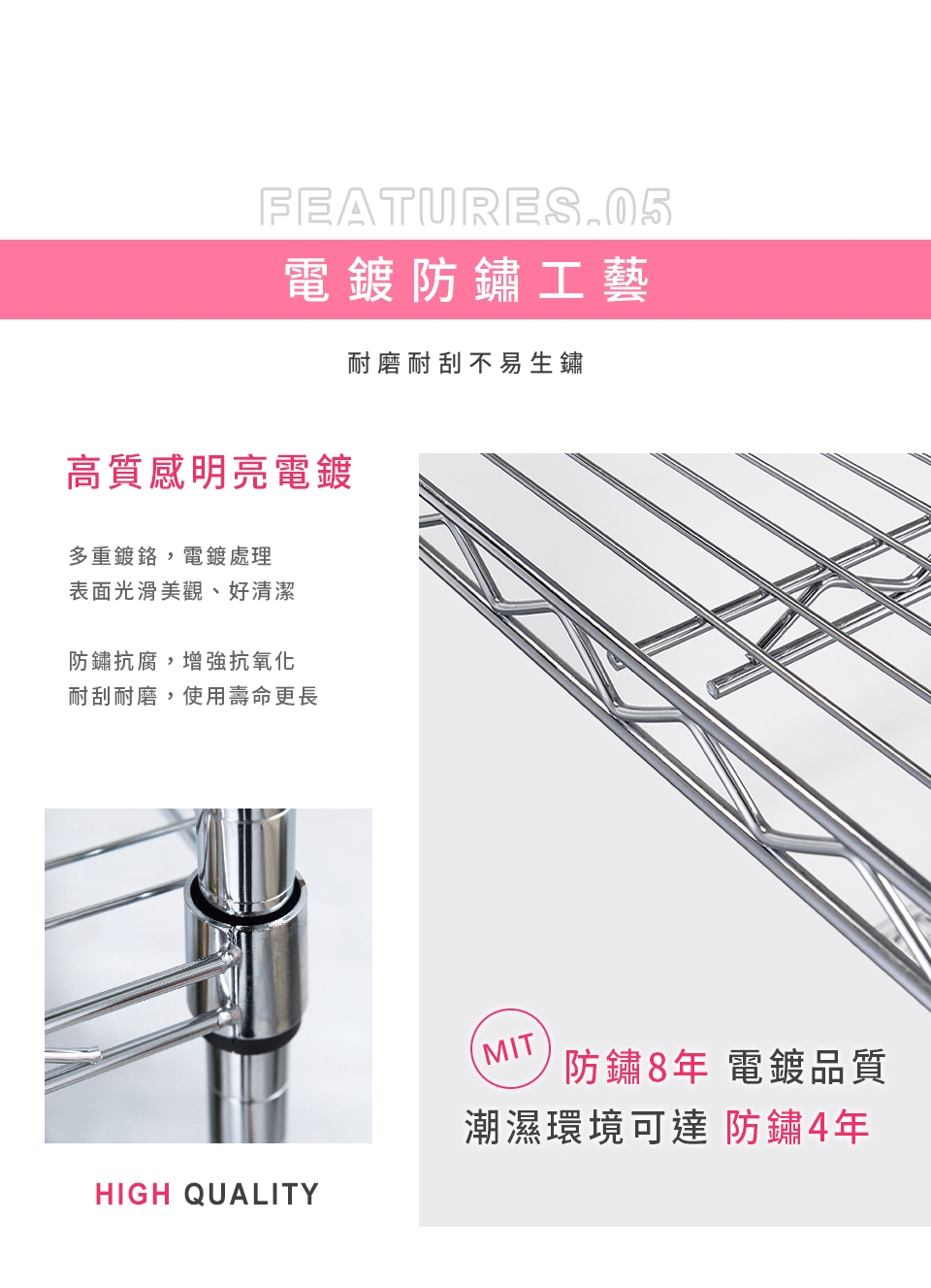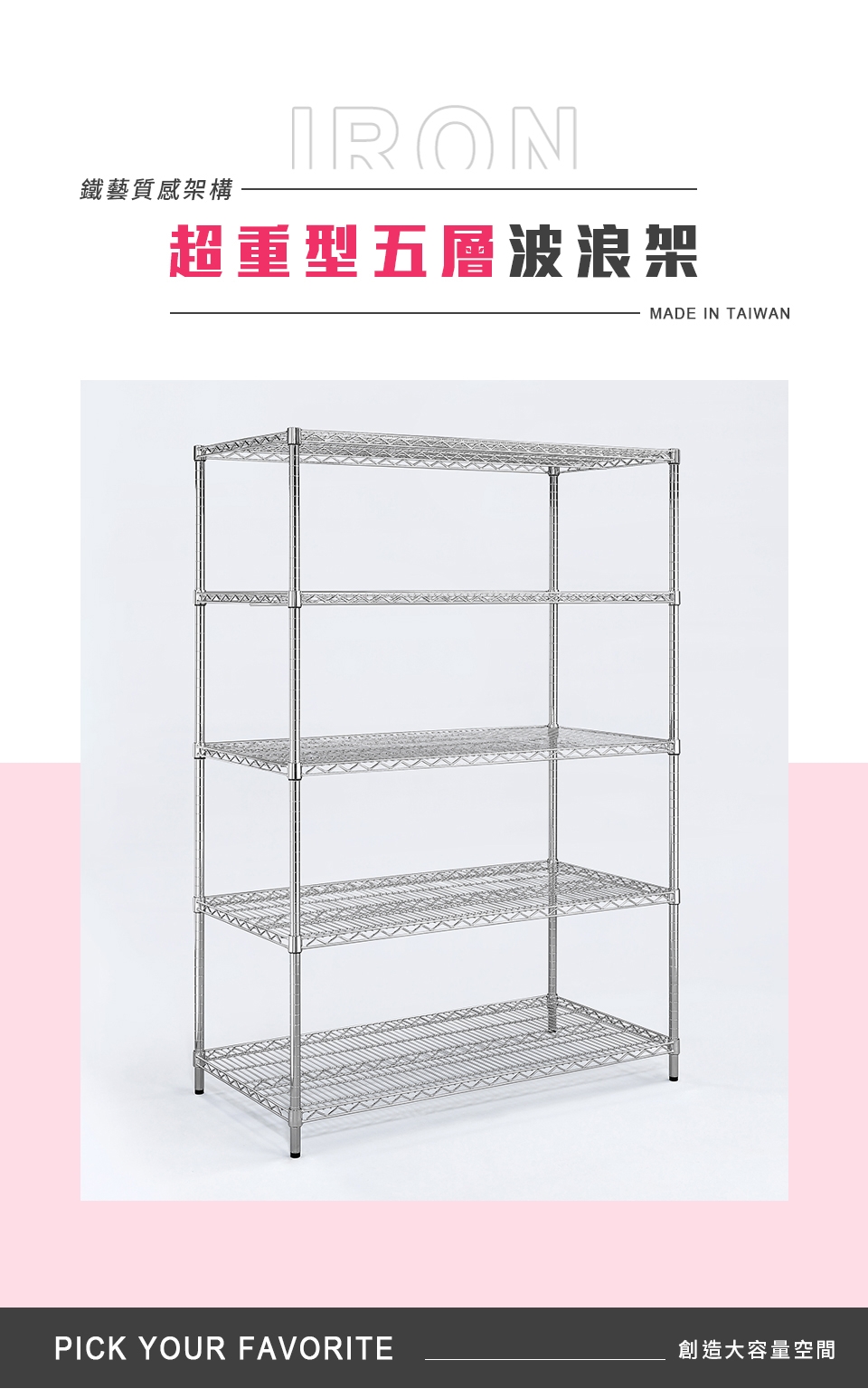 質感鐵力士層架,嚴選MIT中鋼鐵材,表面多重鍍銘、電鍍處理,呈現高質感明亮色澤,防鏽抗腐蝕、承重力強,堅固耐用!