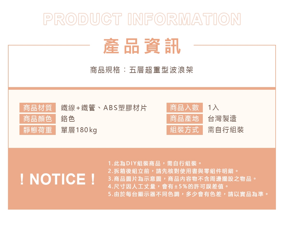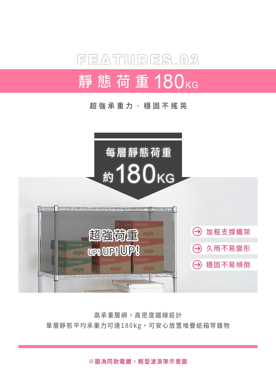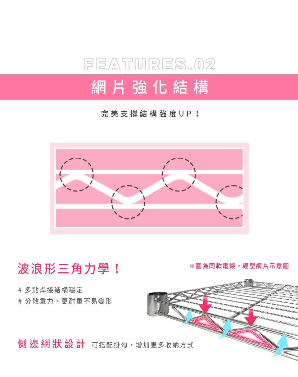 ✓ 高承重層網,單層靜態平均荷重可達180kg,安心放置、穩固耐用。
