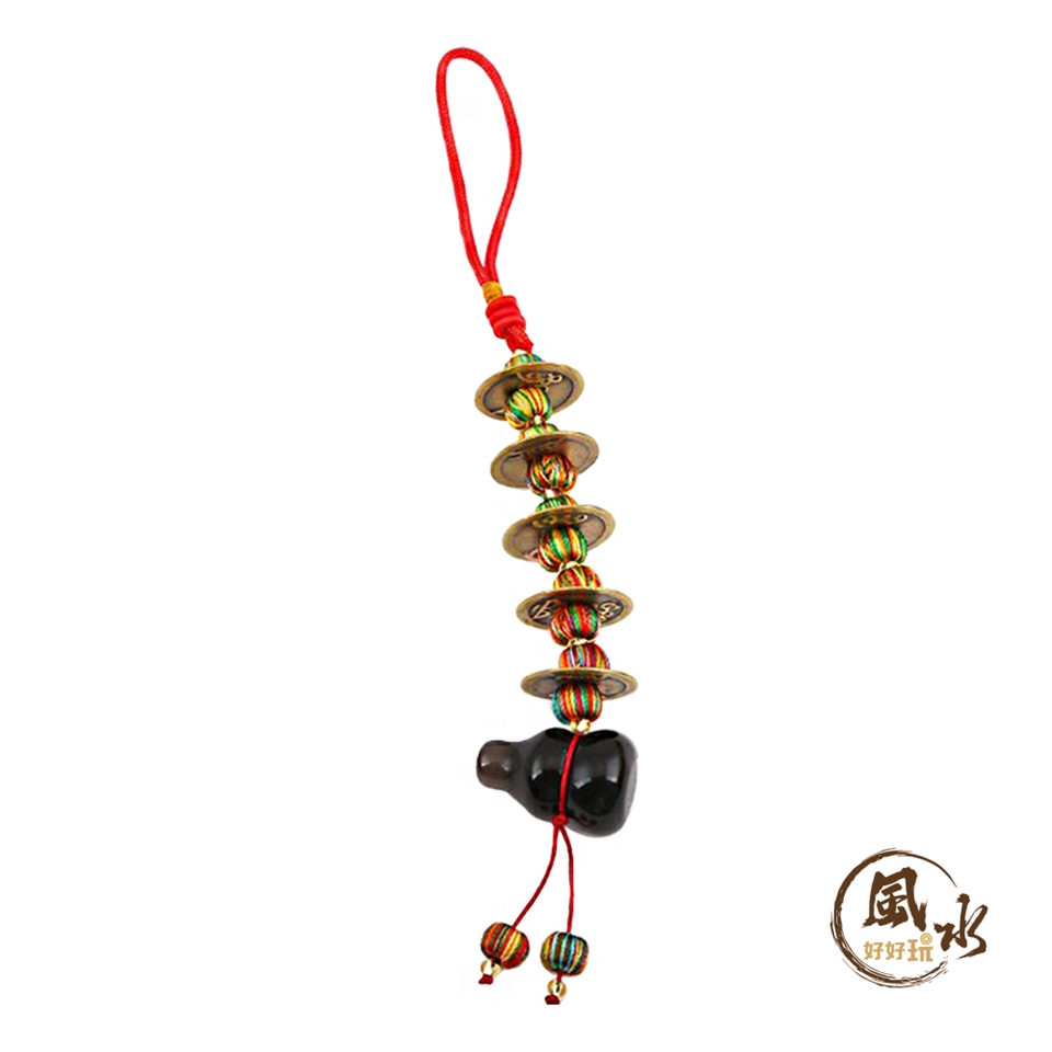將「黑曜五帝錢葫蘆吊飾」掛於屋宅或隨身包包,可藉五帝鴻運,清除穢煞之氣,化散違緣障礙,凝聚福氣善緣。