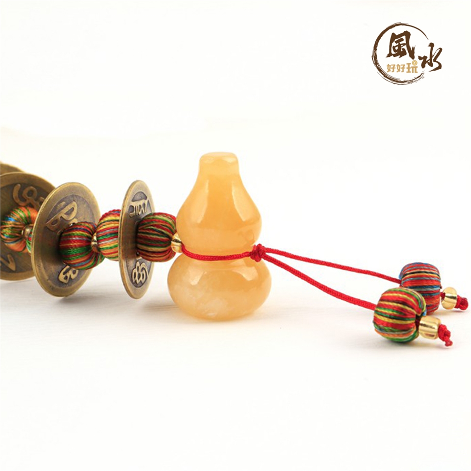 將「黃玉五帝錢葫蘆吊飾」掛於屋宅或隨身包包,可藉五帝鴻運,清除穢煞之氣,廣納天下之財,凝聚福氣善緣。