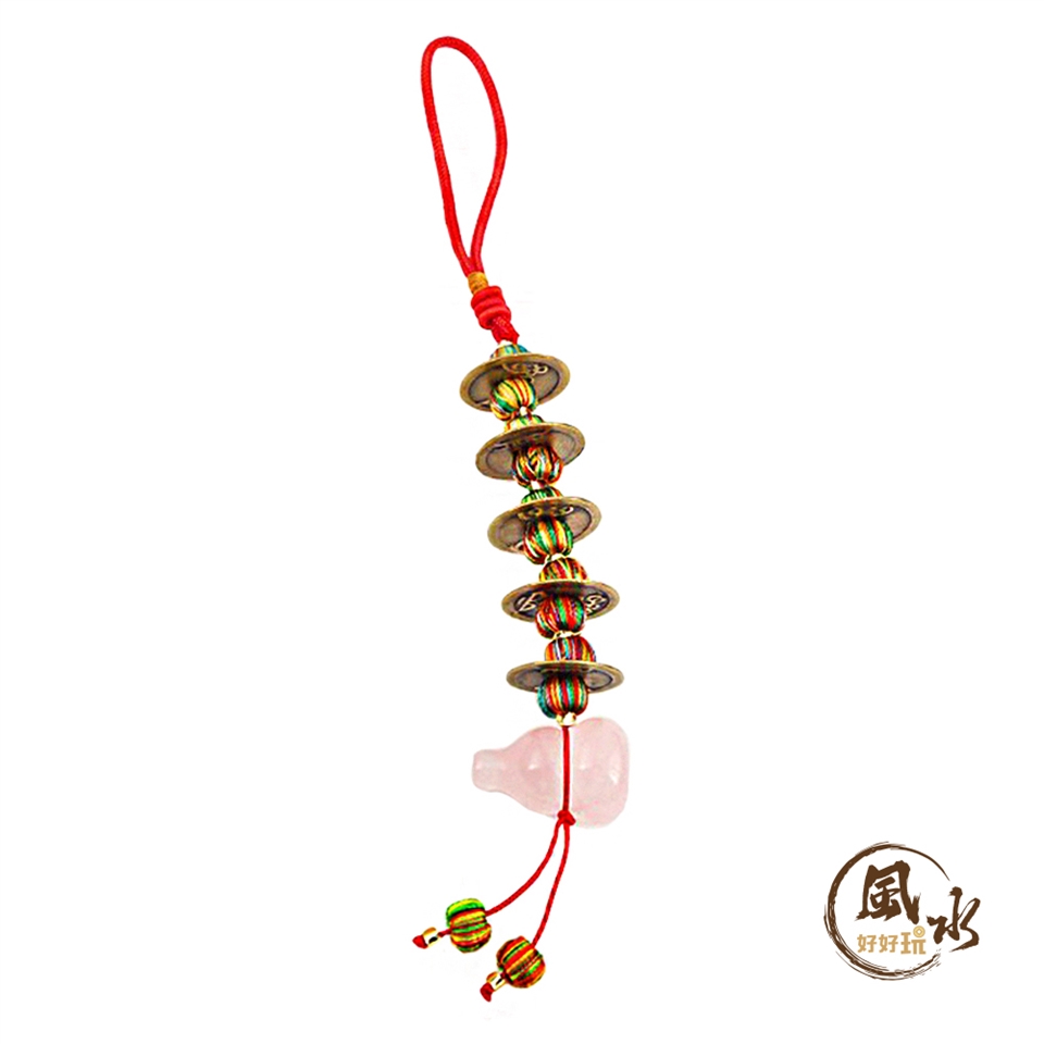 將「粉晶五帝錢葫蘆吊飾」掛於屋宅或隨身包包,可藉五帝鴻運,清除穢煞之氣,添增人緣魅力,凝聚福氣善緣。