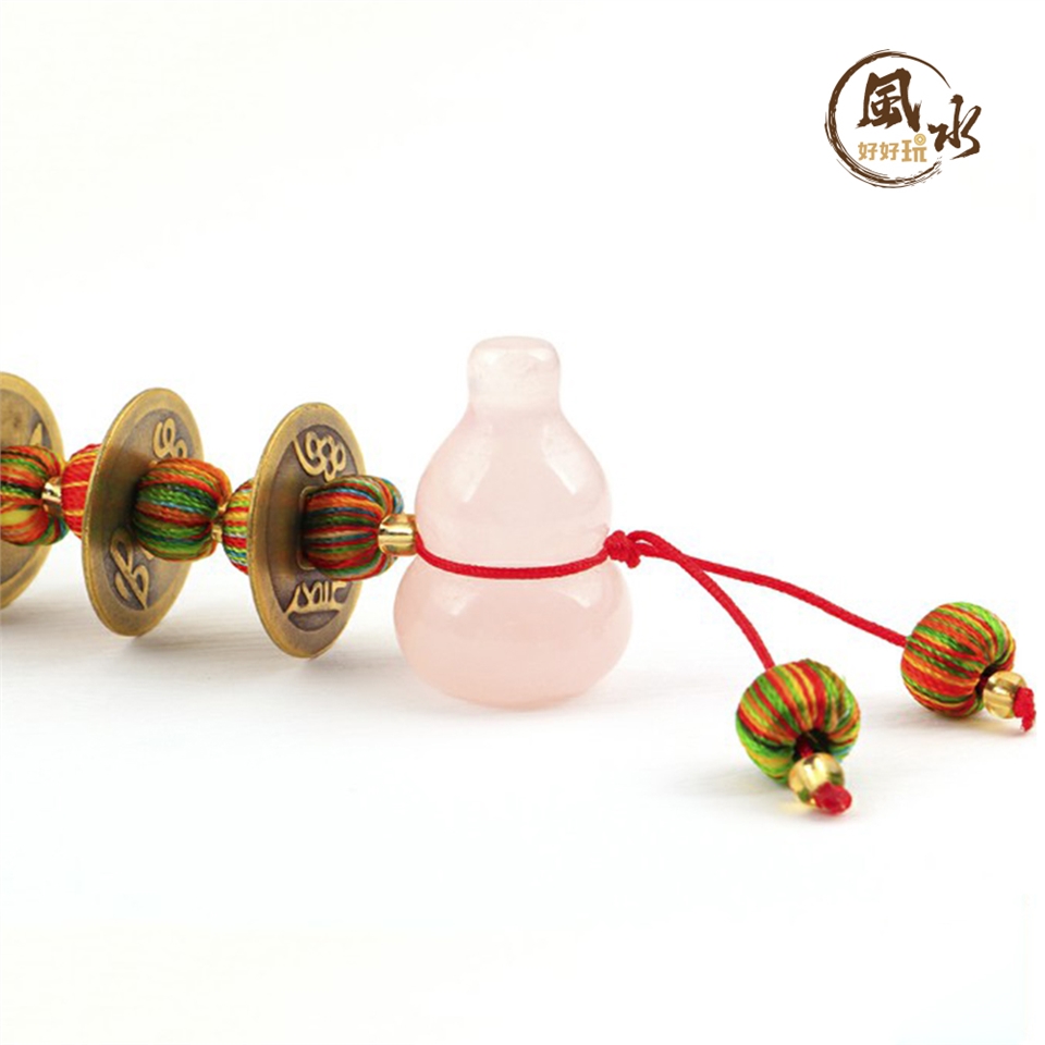 以五帝錢串接粉晶葫蘆,粉晶蘊含火行能量、能強化人緣氣場;葫蘆其諧音「福祿」,形狀窄口大肚、易入難出,具有收妖制煞、納財添福的功用。