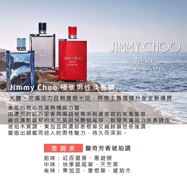 Jimmy Choo Man Extreme極致淡香精是一款充滿冒險精神的強烈香氛,它大膽、充滿活力且刺激感十足,將男士香氛提升至全新境界。這款香氛專為堅定自信、掌握自身命運、渴望挑戰新體驗並熱愛戶外冒險的男士打造。