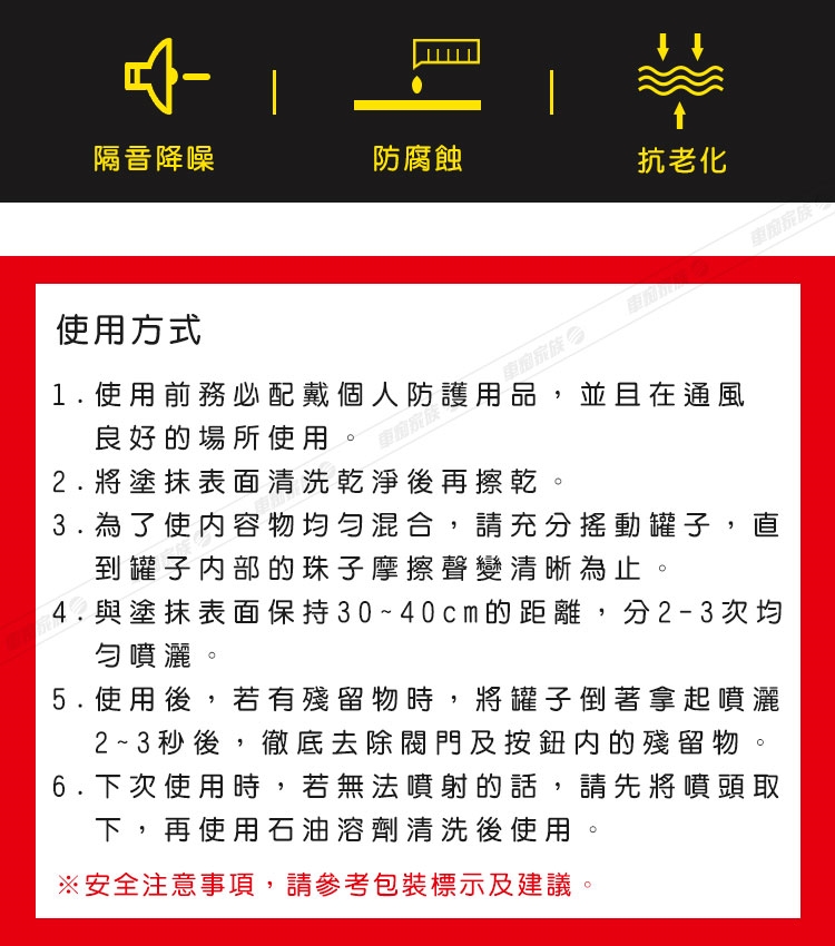 ◎使用範圍:汽車底盤、輪拱、骨架圍欄及防護板等