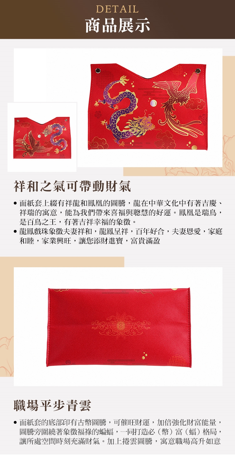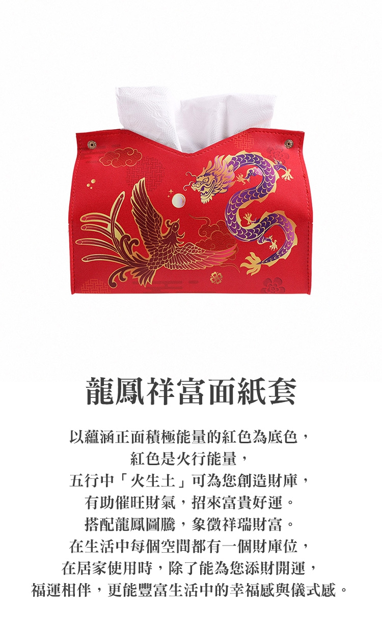 在生活中每個空間都有一個財庫位,「龍鳳祥富面紙套」可在居家使用時,除了能為您添財開運,福運相伴,更能豐富生活中的幸福感與儀式感。