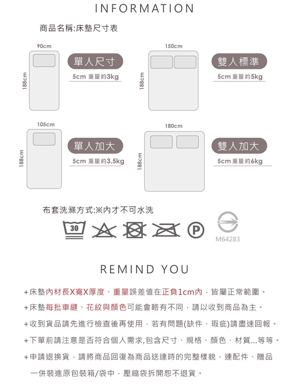 ※如商品因試睡、洗滌等等...產生異味與明顯使用痕跡 恕不接受退換貨。