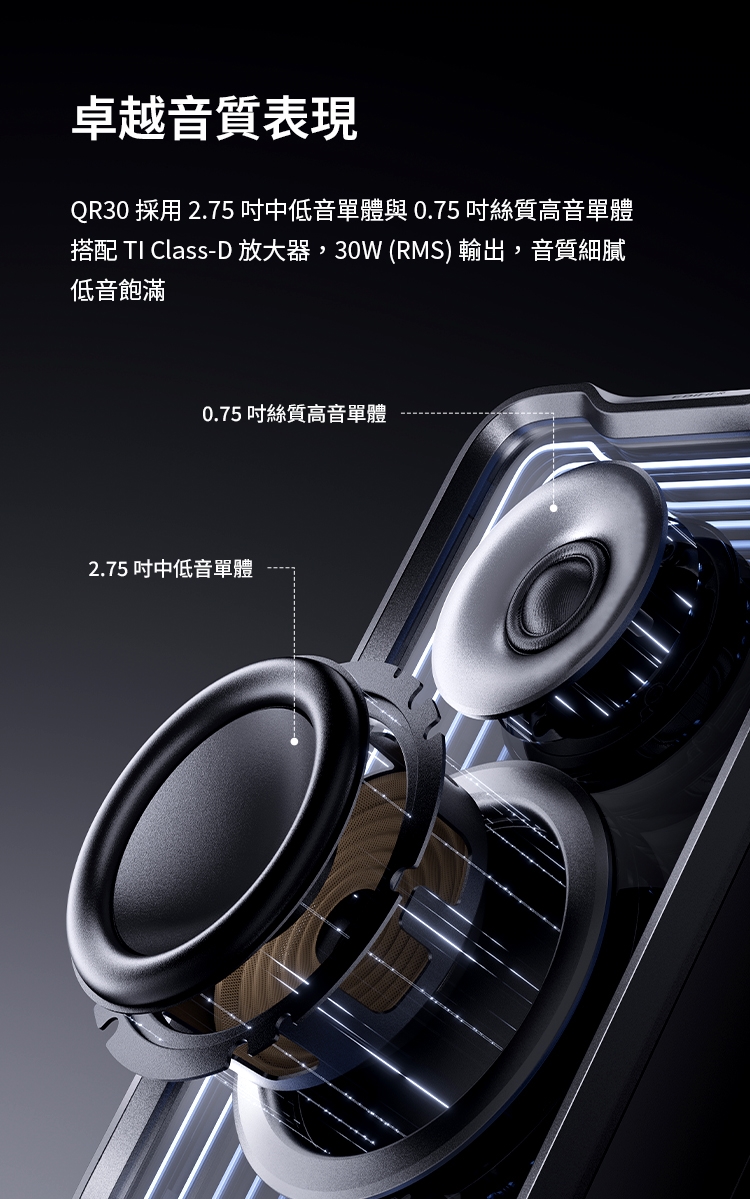 高解析單體|搭載 2.75 吋中低單體及絲質高音,聲音均衡自然,高頻清亮、中低音飽滿,細節表現出色。