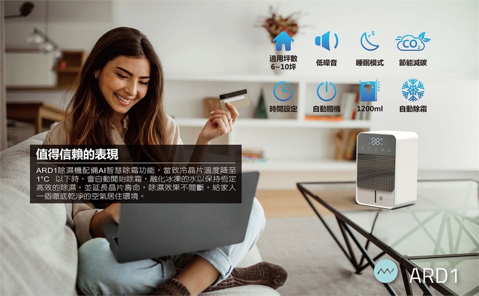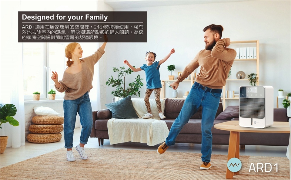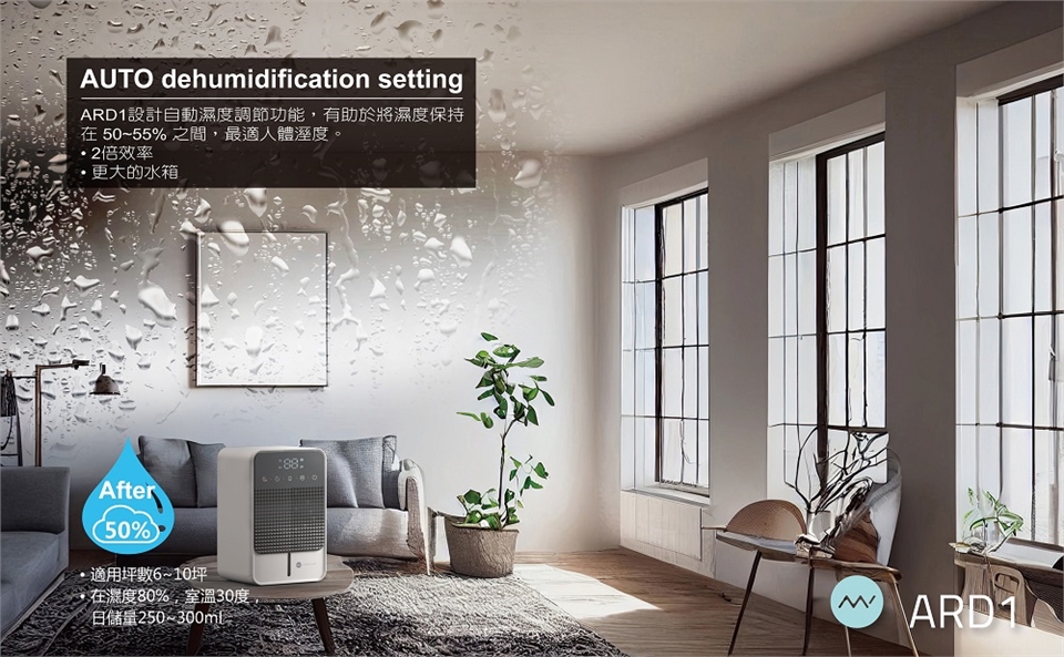 . 第六代半導體冷凝技術、升級50%高效能除濕:ARD1除濕機採用半導體冷凝技術, 冷卻效率提高並確保安靜運 行,同時有效地從空氣中提取水分。此先進功能有助於將濕度保持在 50~55% 之間,最適人體溼度
